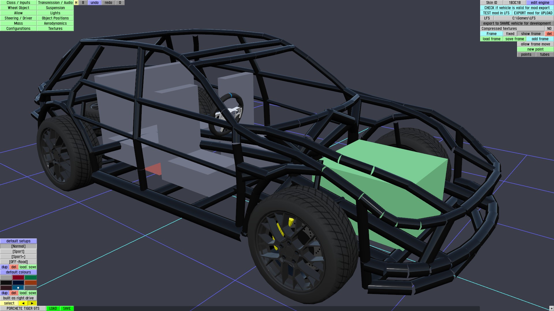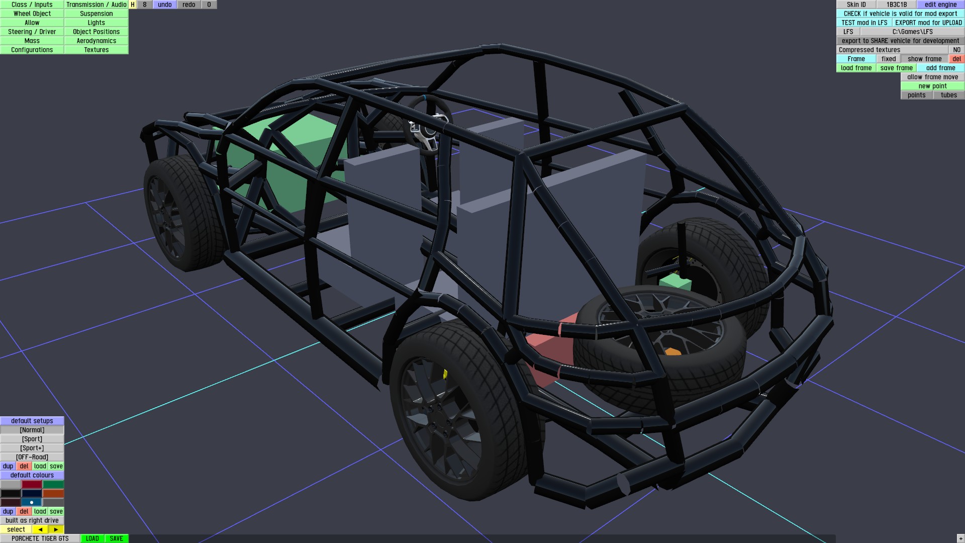 -Car's exterior is made by me in blender, edited in LFS Editor. Rims, Steering wheel (both made by me in LFS Editor) & Interior are taken from my mod FZ70 but Interior is heavily modified to match with TigerGTS.