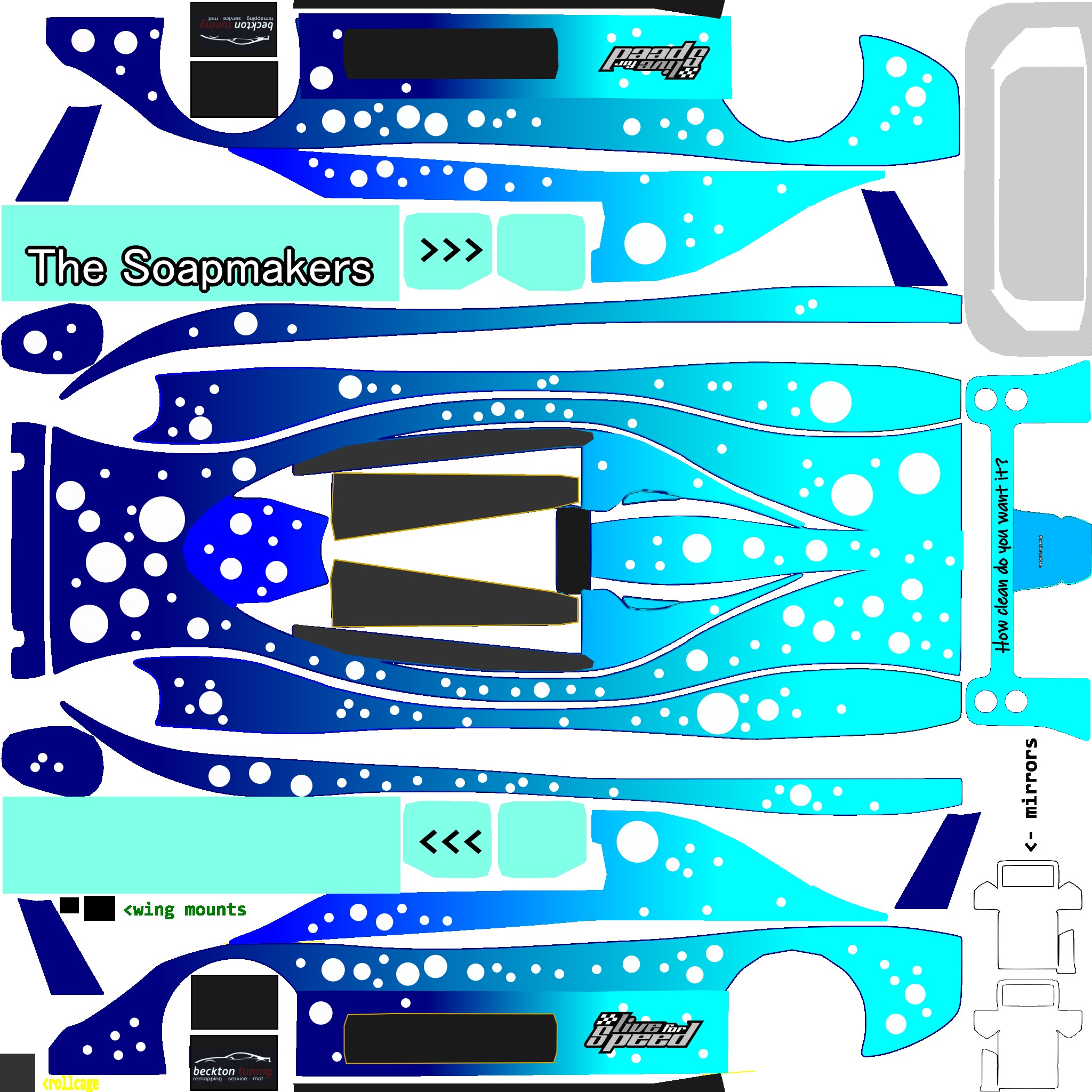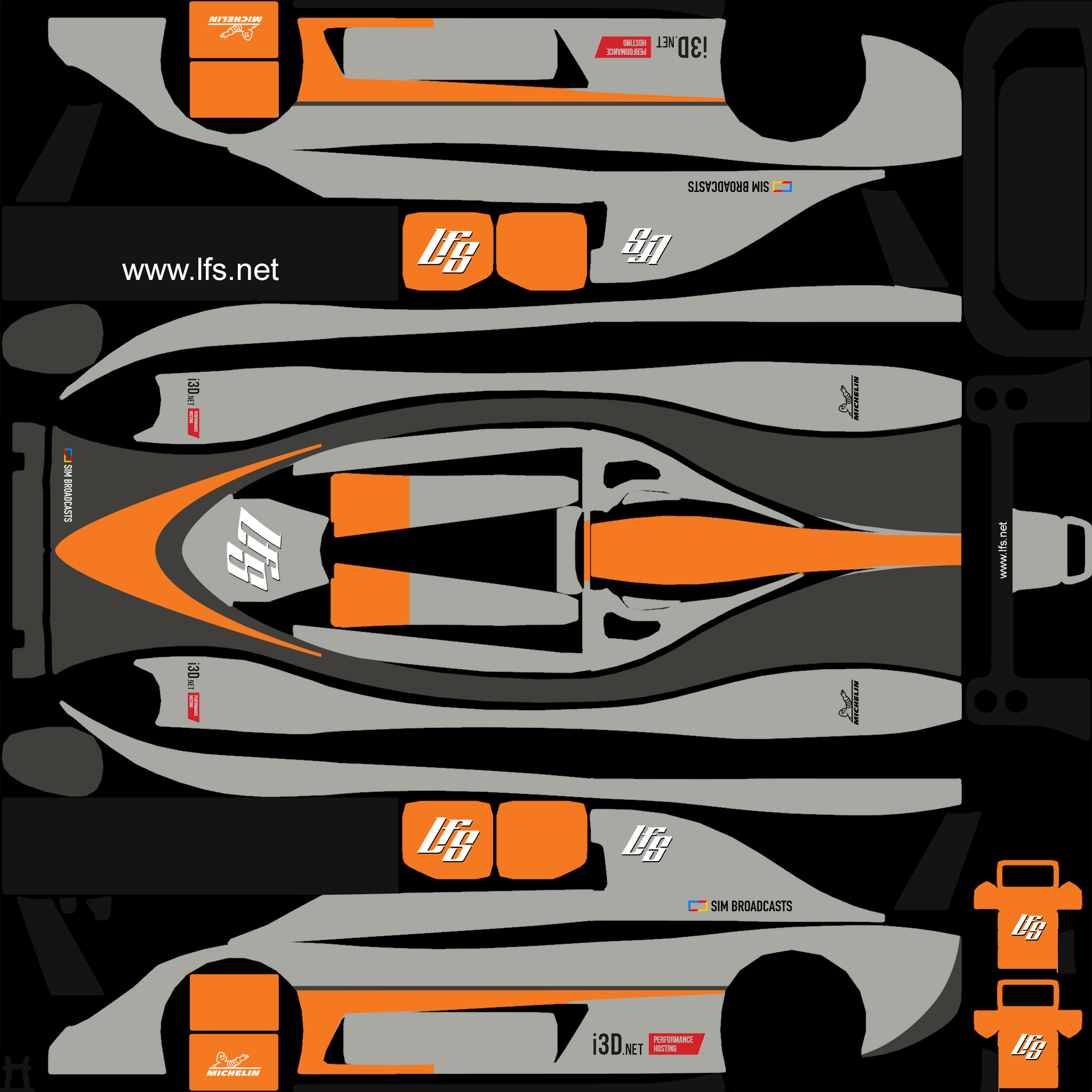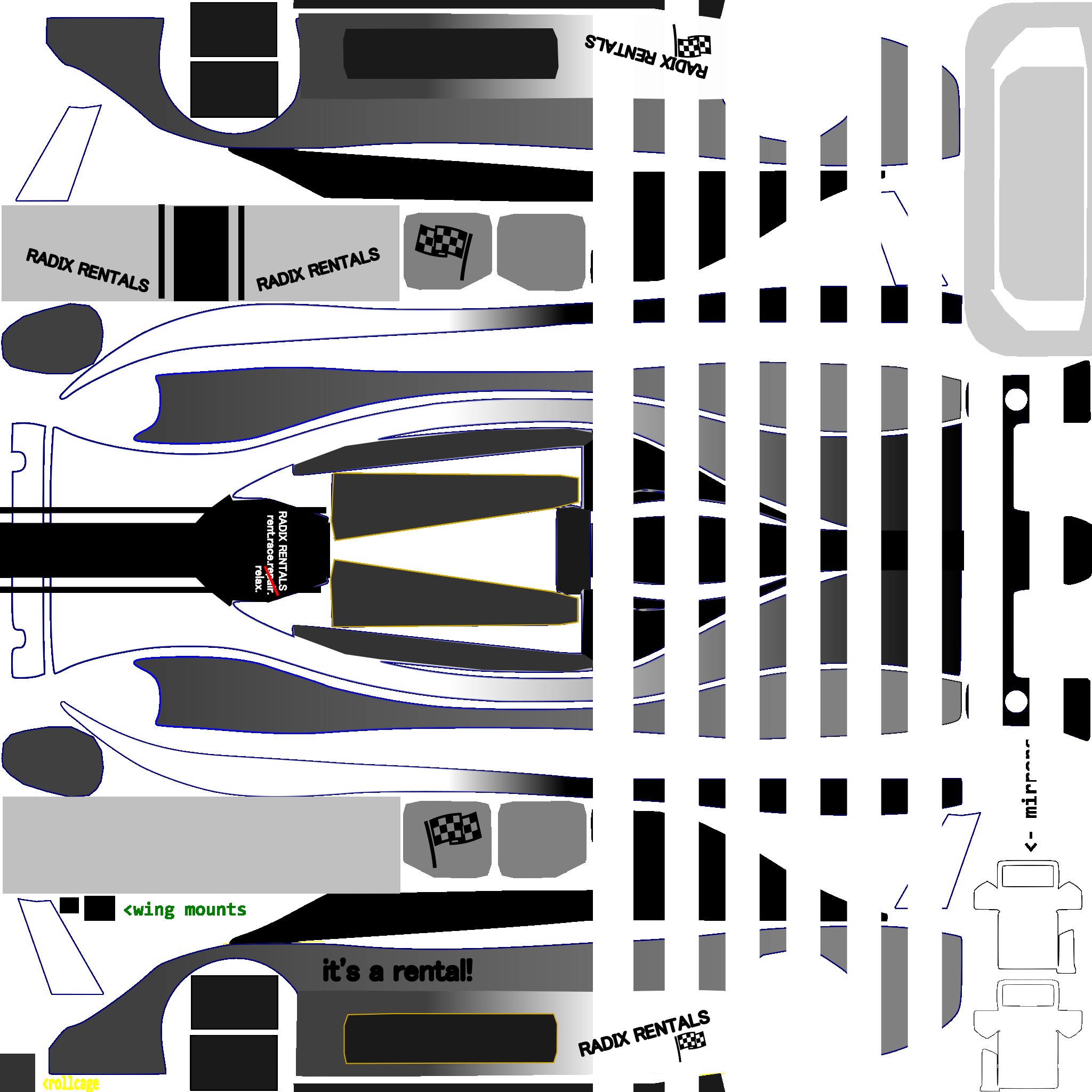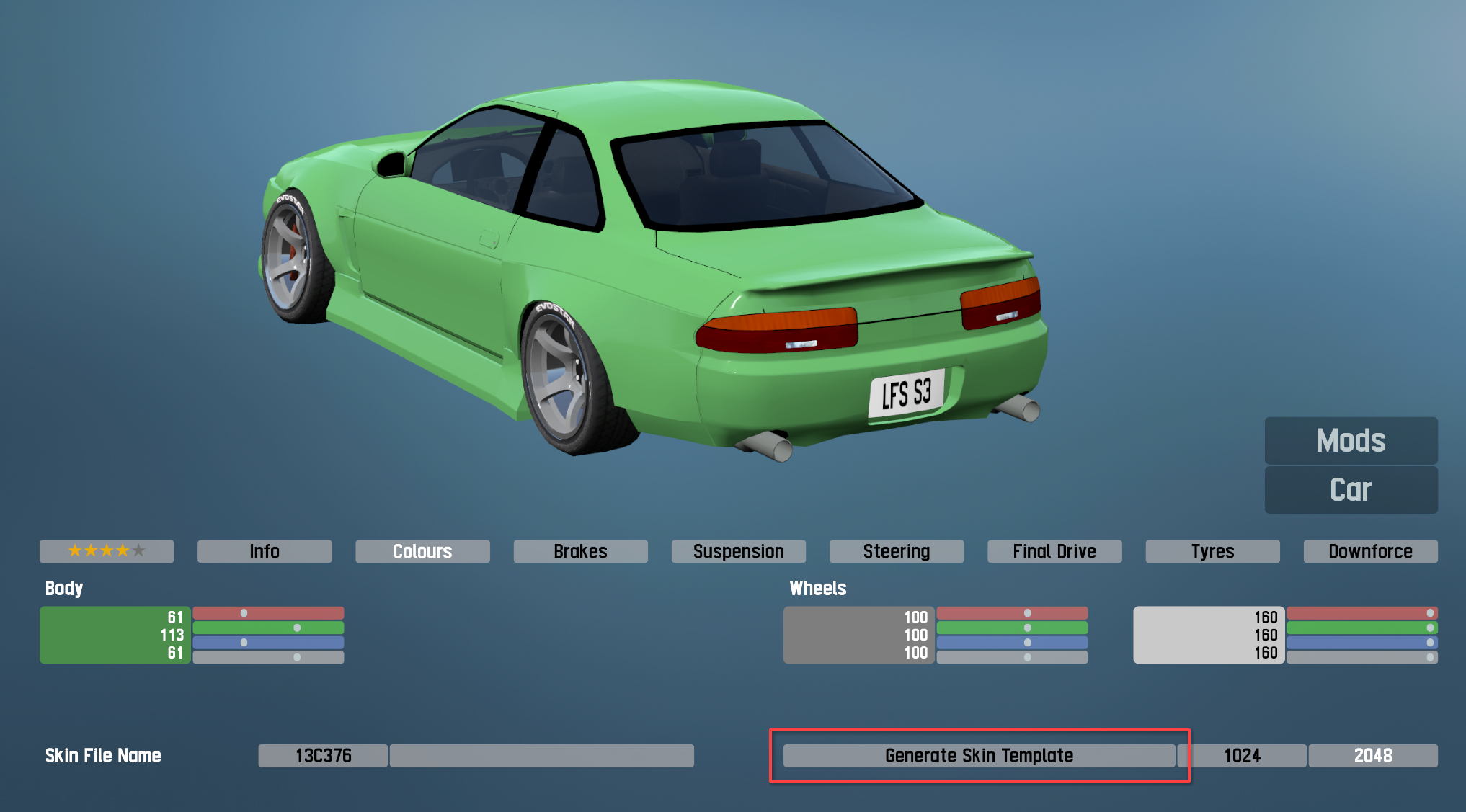 The LFS Vehicle editor provides options to create skin templates. A template helps you create skins for a vehicle by giving you the outlines of the vehicle's shape, within which you can draw the livery that will be drawn onto the vehicle.