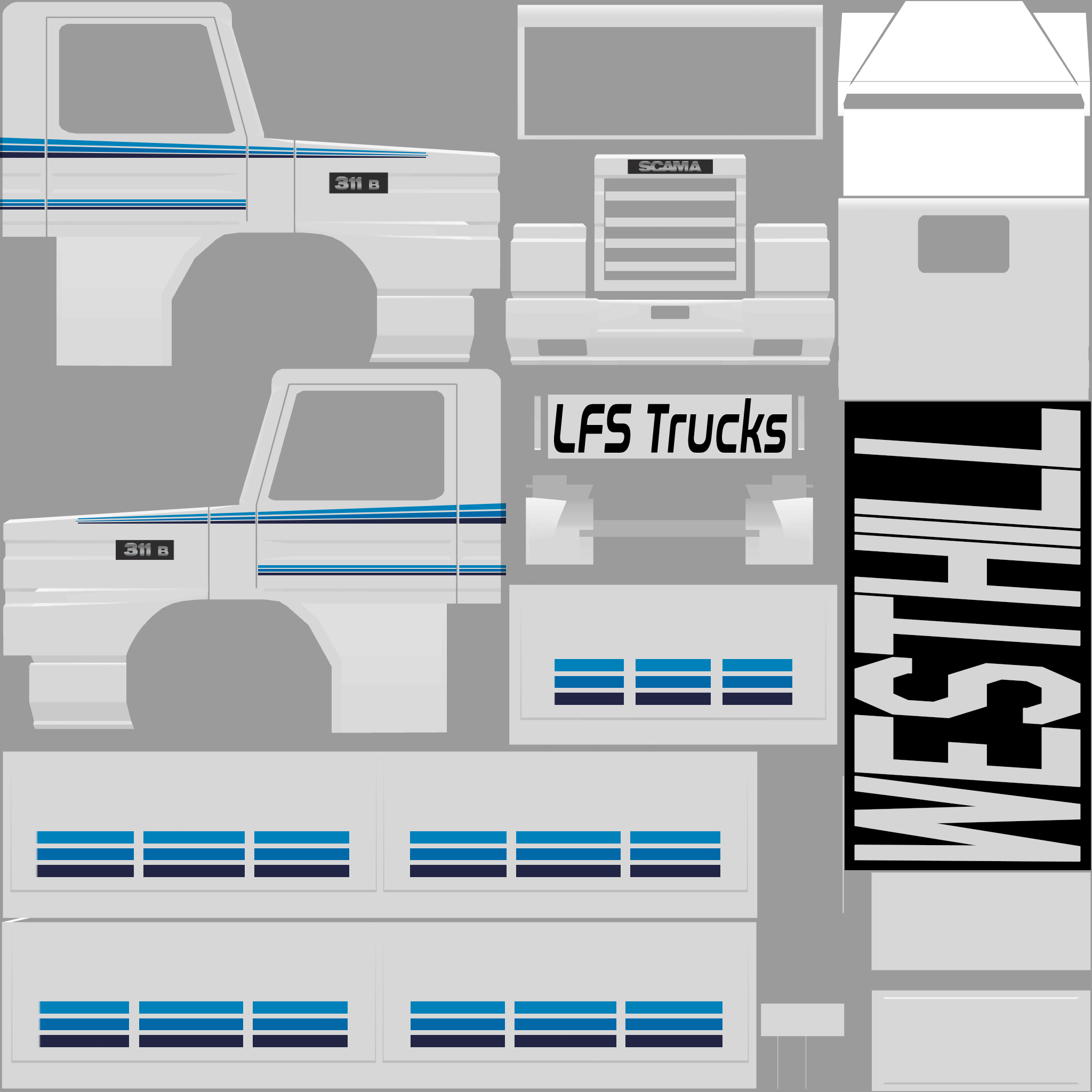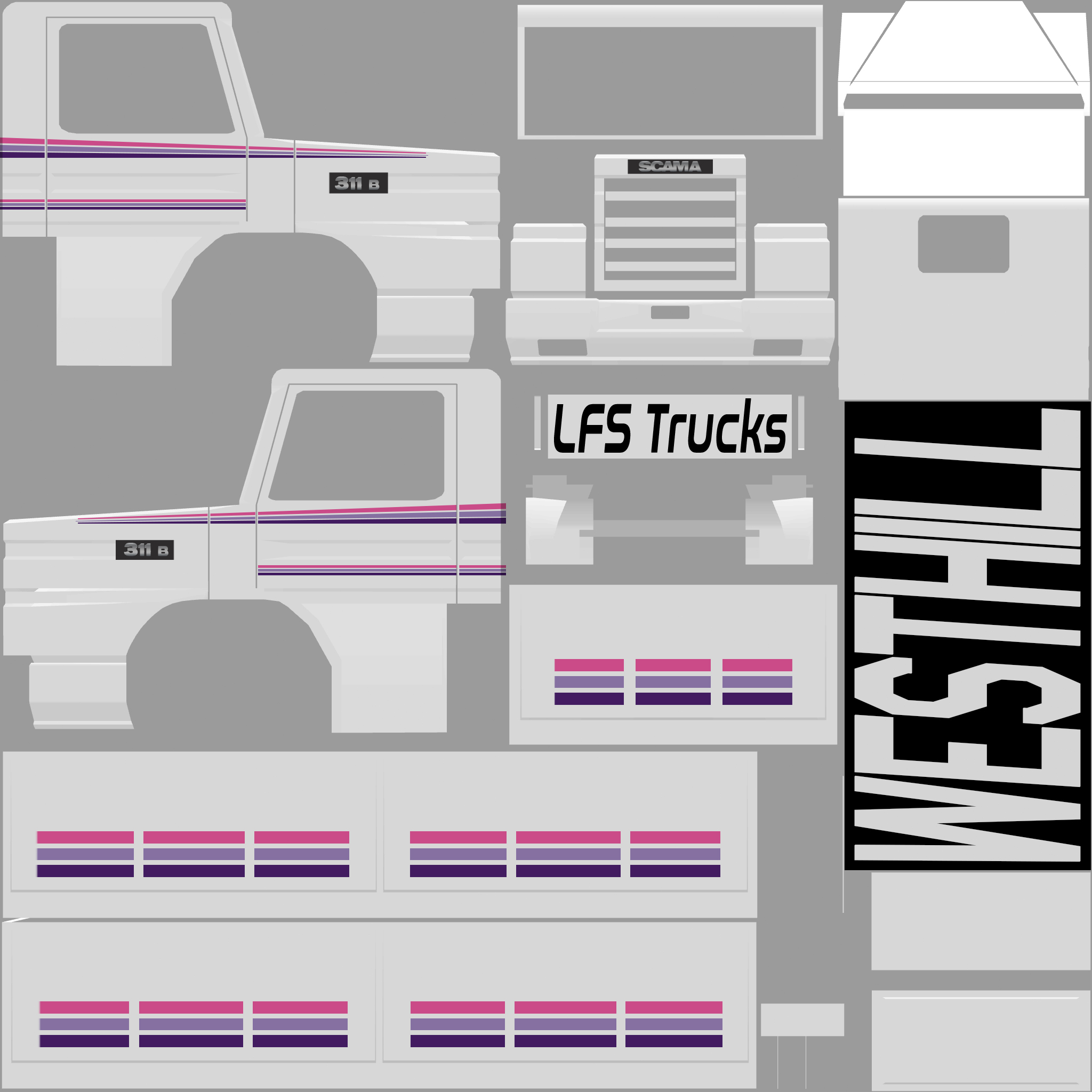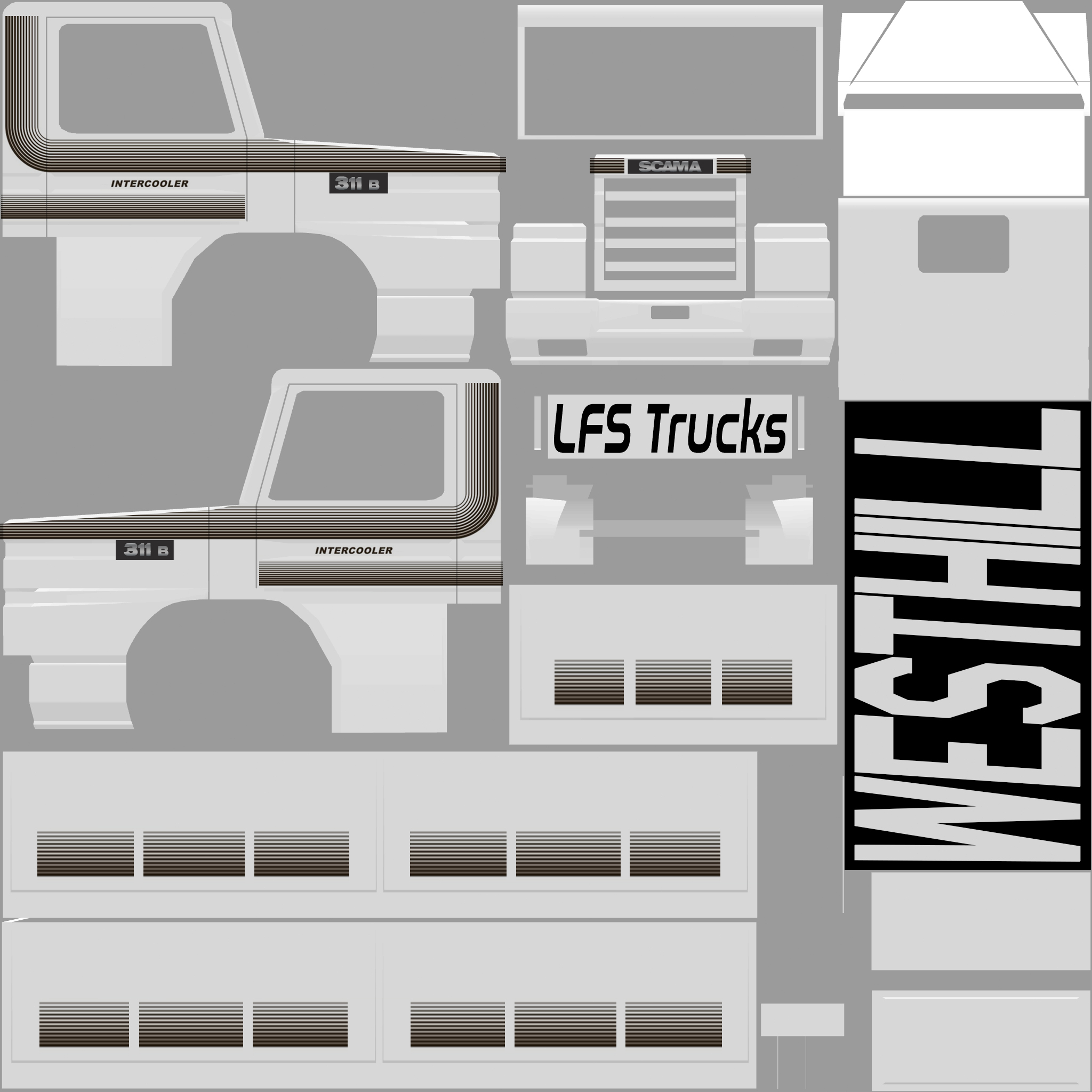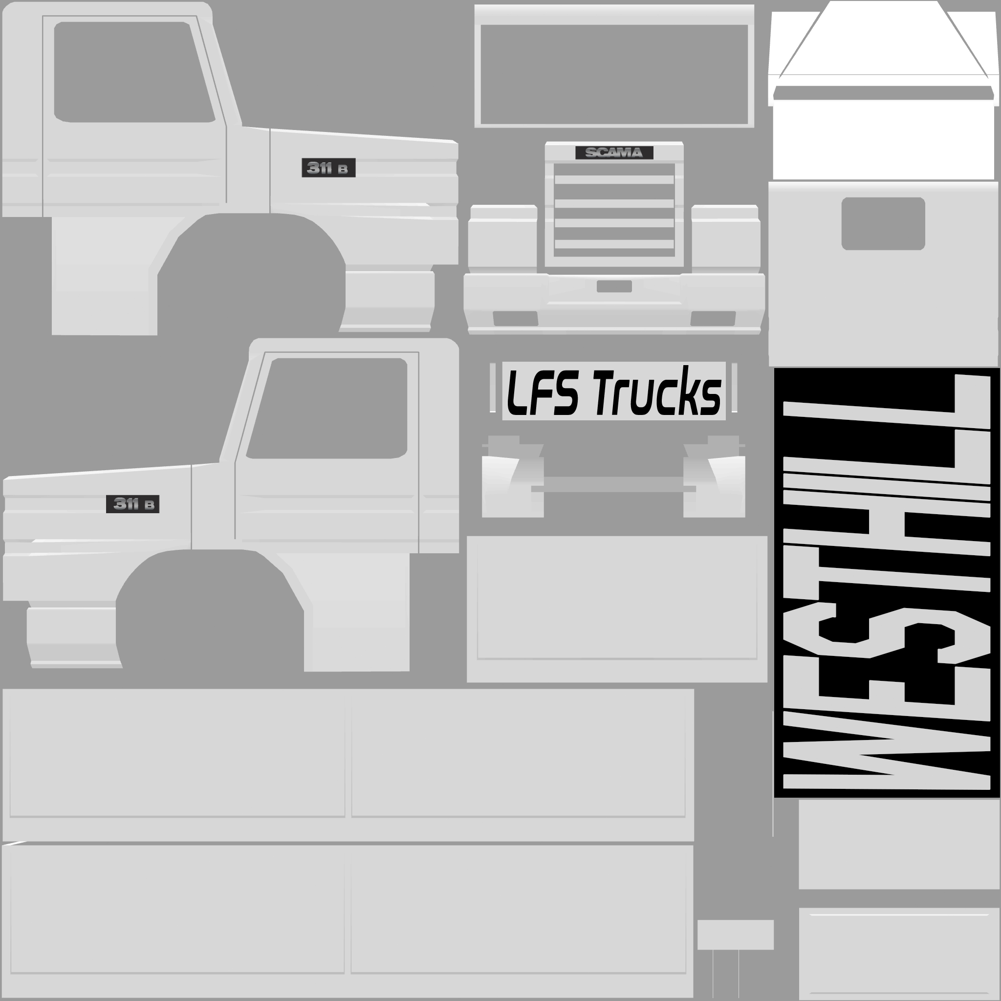 The LFS Vehicle editor provides options to create skin templates. A template helps you create skins for a vehicle by giving you the outlines of the vehicle's shape, within which you can draw the livery that will be drawn onto the vehicle.