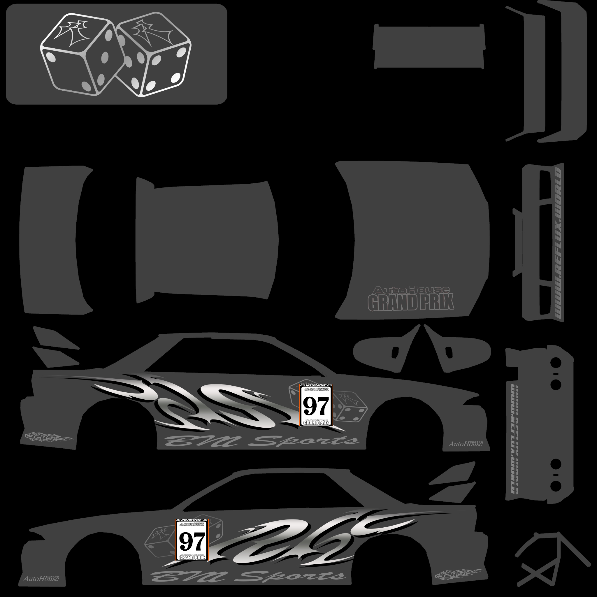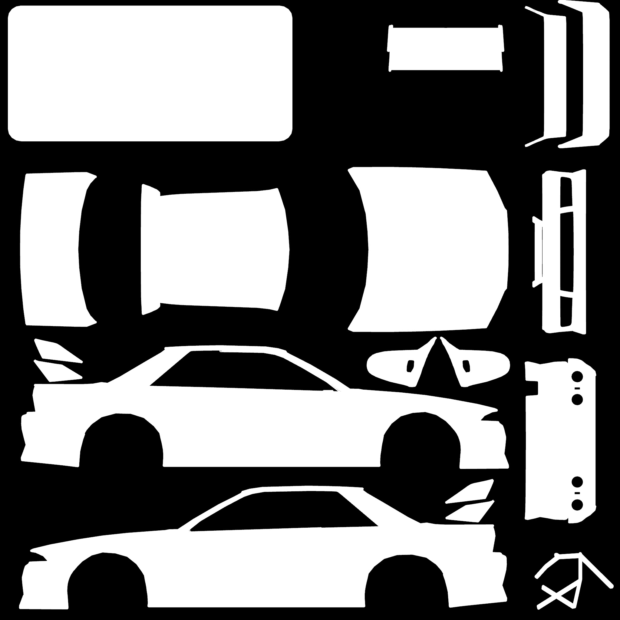 The LFS Vehicle editor provides options to create skin templates. A template helps you create skins for a vehicle by giving you the outlines of the vehicle's shape, within which you can draw the livery that will be drawn onto the vehicle.