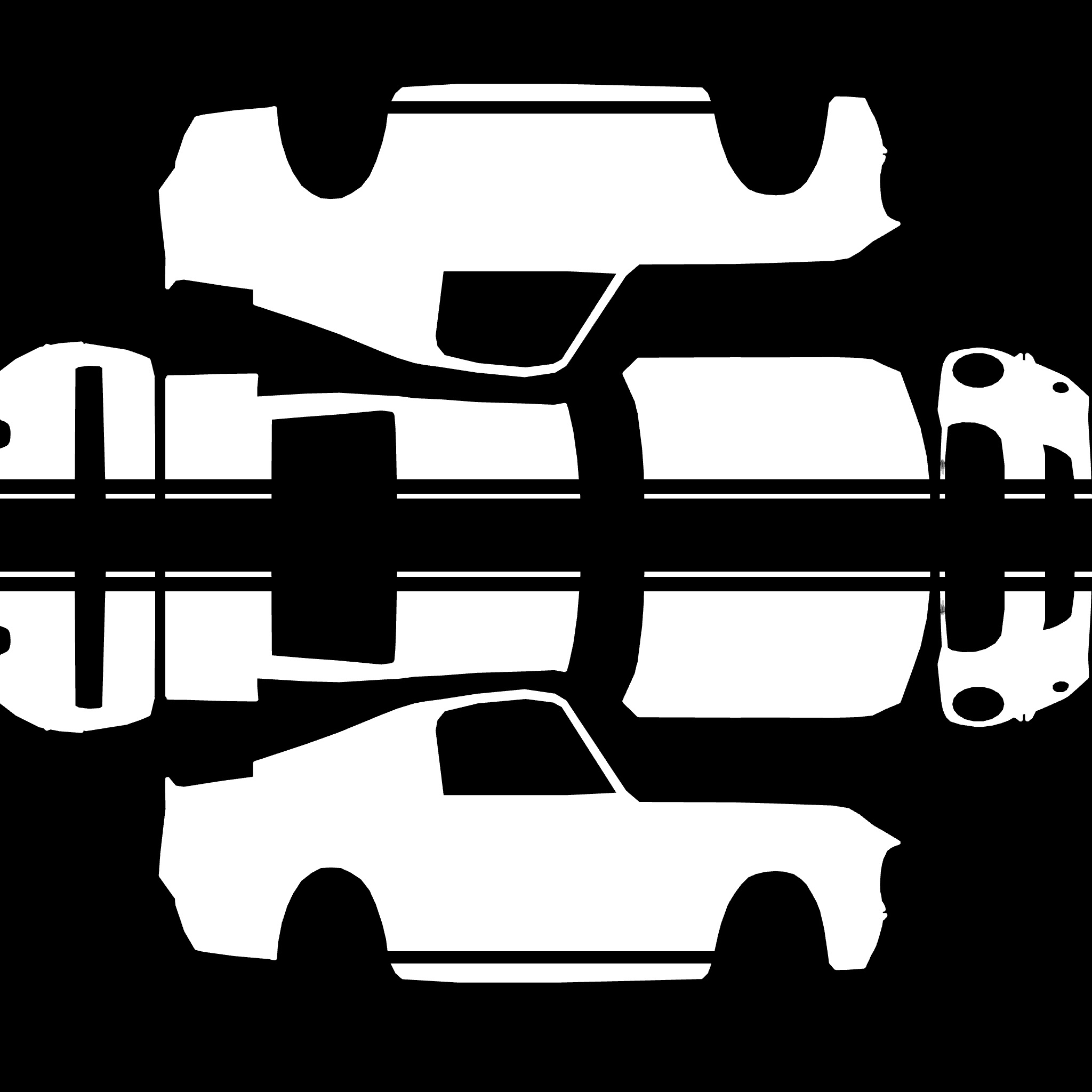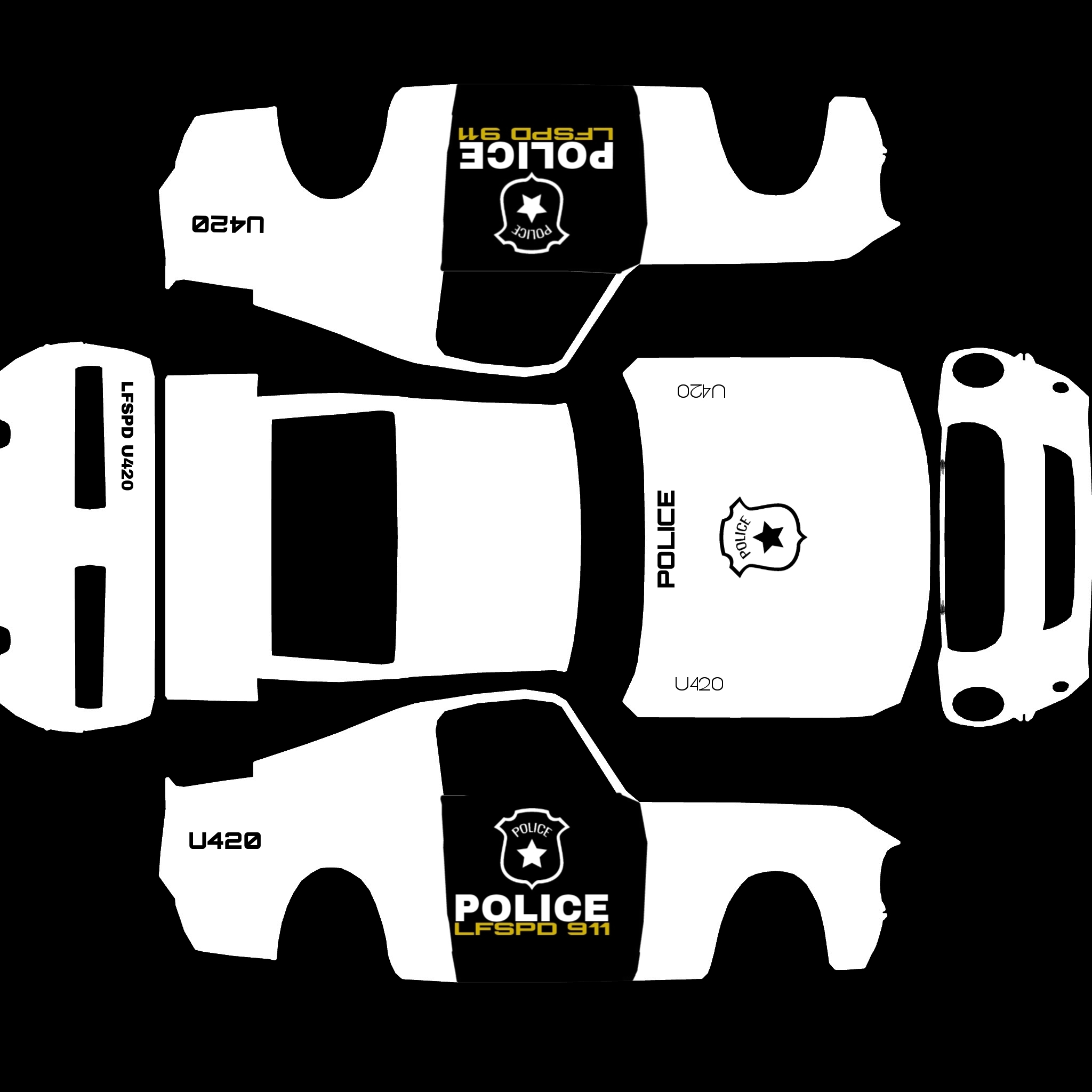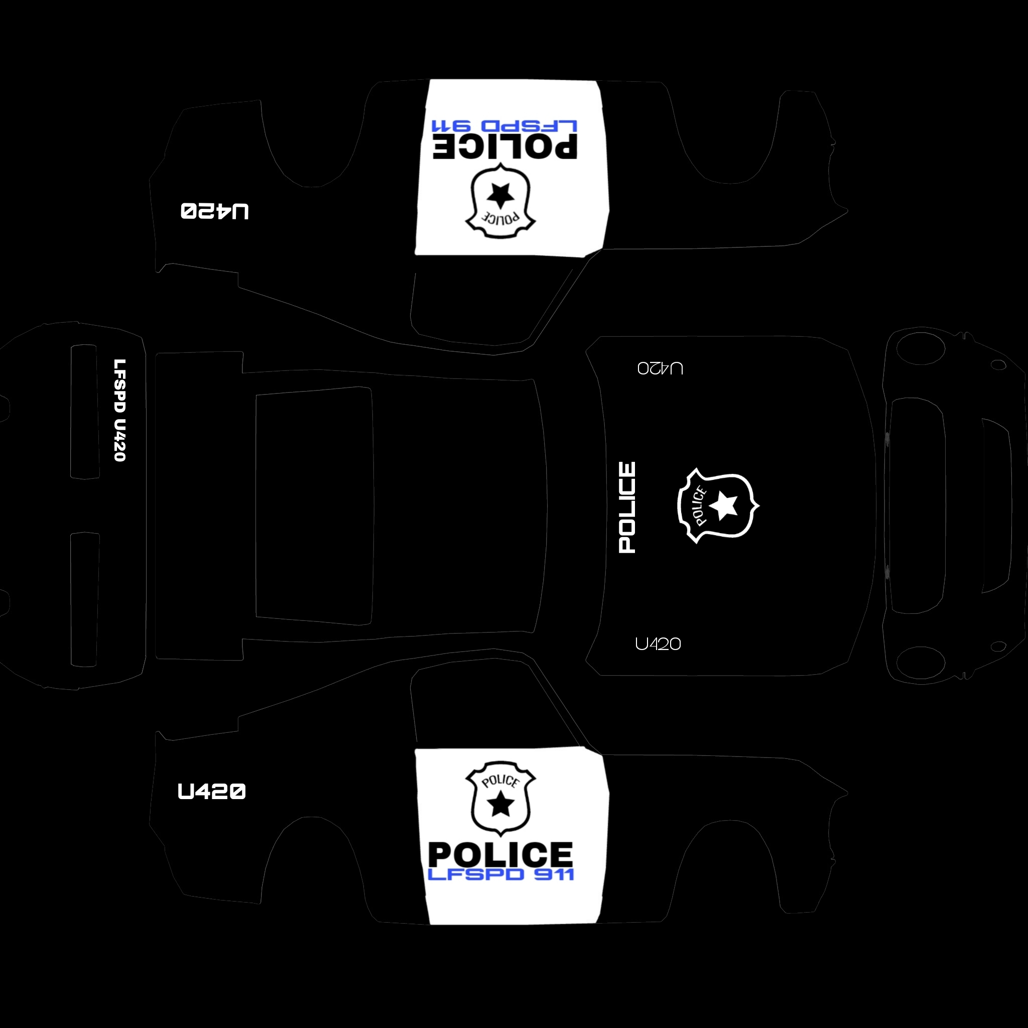 The LFS Vehicle editor provides options to create skin templates. A template helps you create skins for a vehicle by giving you the outlines of the vehicle's shape, within which you can draw the livery that will be drawn onto the vehicle.