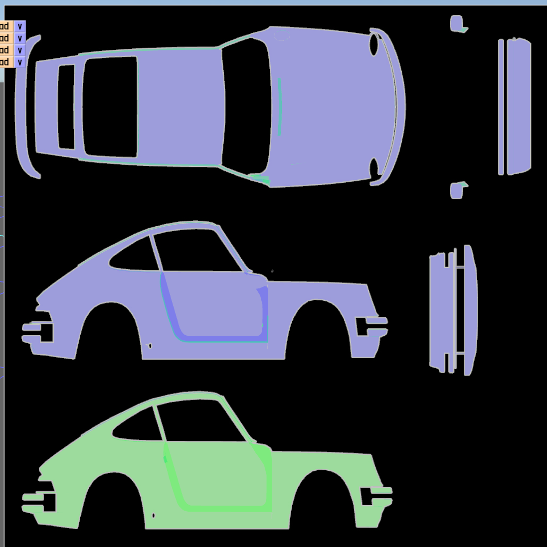 The LFS Vehicle editor provides options to create skin templates. A template helps you create skins for a vehicle by giving you the outlines of the vehicle's shape, within which you can draw the livery that will be drawn onto the vehicle.