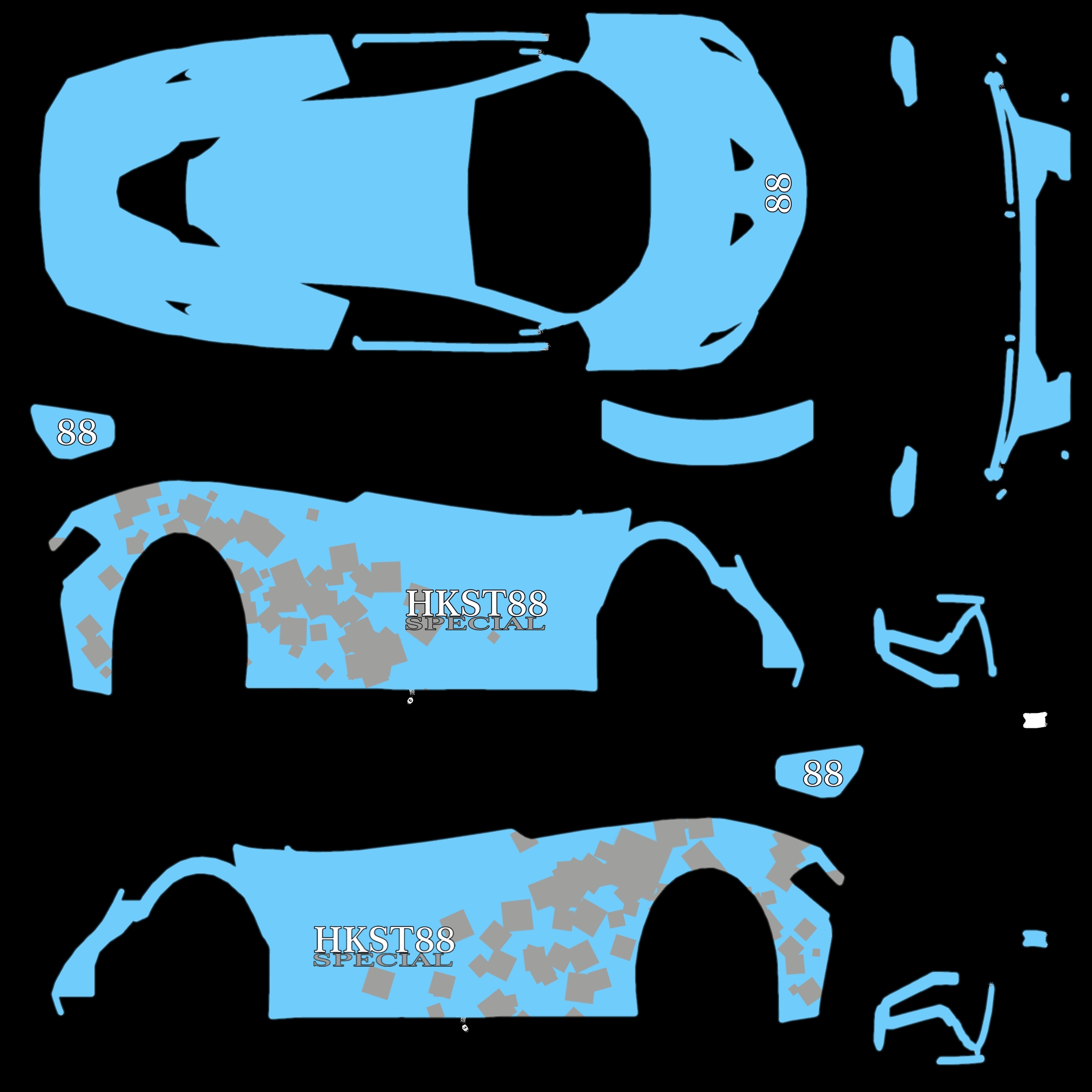 The LFS Vehicle editor provides options to create skin templates. A template helps you create skins for a vehicle by giving you the outlines of the vehicle's shape, within which you can draw the livery that will be drawn onto the vehicle.