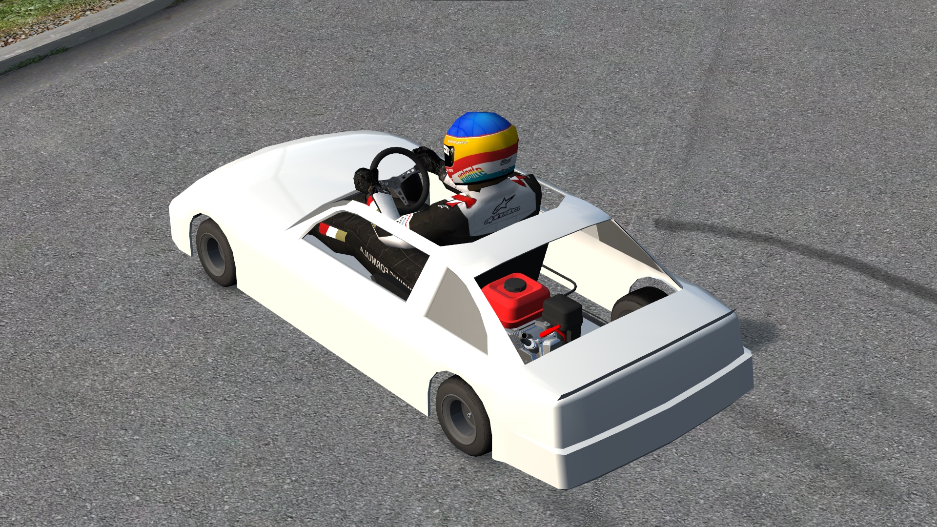 The author of this Vehicle Mod has indicated that this work is an original creation and has provided the following description of the approach:Started by creating a simple frame as if i was welding it together irl, referenced videos and old photos. Shell is simple "nascar" "stock car" look, low poly made to look like fibreglass shell for decals to be put on. Engine was modelled using reference images and my own take on the 212cc crate engines you can buy, used a model i found online as a reference for scaling and shaping. (Link: https://cults3d.com/en/3d-model/game/motor-honda-160-mini-bike-go-kart)