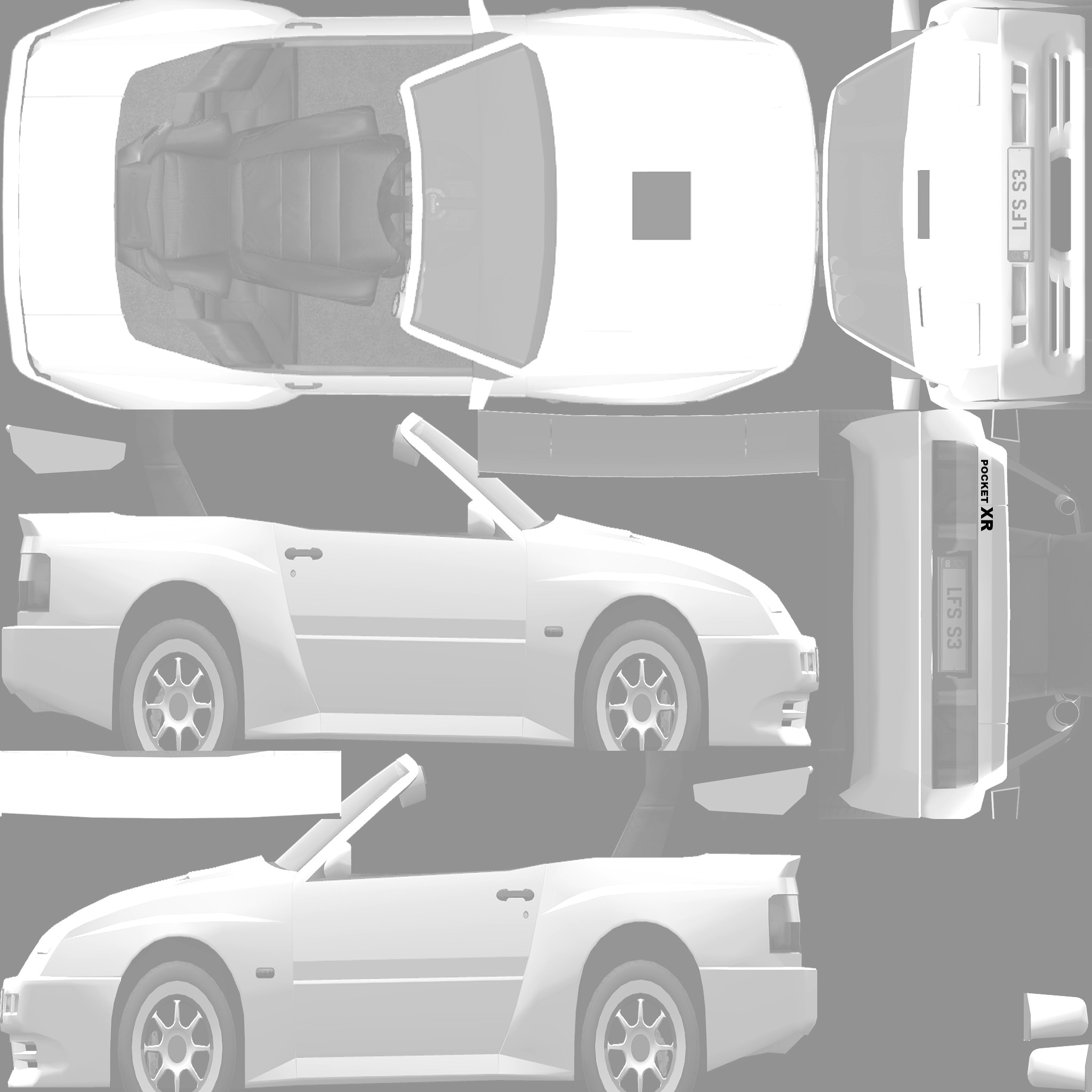 The LFS Vehicle editor provides options to create skin templates. A template helps you create skins for a vehicle by giving you the outlines of the vehicle's shape, within which you can draw the livery that will be drawn onto the vehicle.