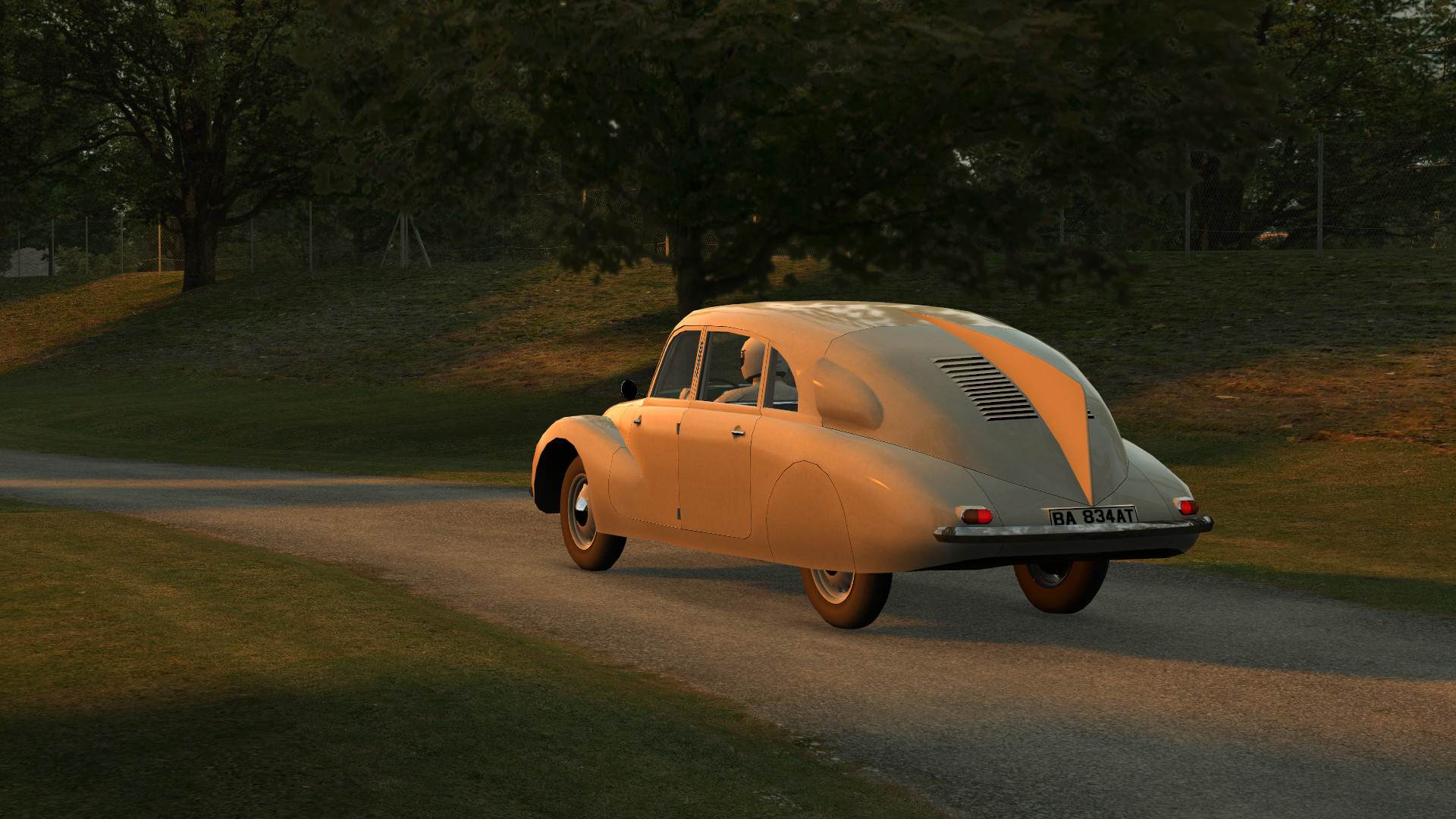Due to the fully independent suspension, this is one of a few 1930s cars which can be simulated in the LFS, without some rough approximations of solid axles. The suspension is stiffer to reproduce a non-linearity of a transverse leaf springing. Using modern radial tires, the car can be easily flipped over. Therefore there are two stock setups with different approximations of the original bias-ply tires. The "adventure" setup uses knobbly tires, while the "classic" setup uses overinflated road tires. To keep realism of the mod, please avoid camber adjustments on the rear axle when creating personal setups.
