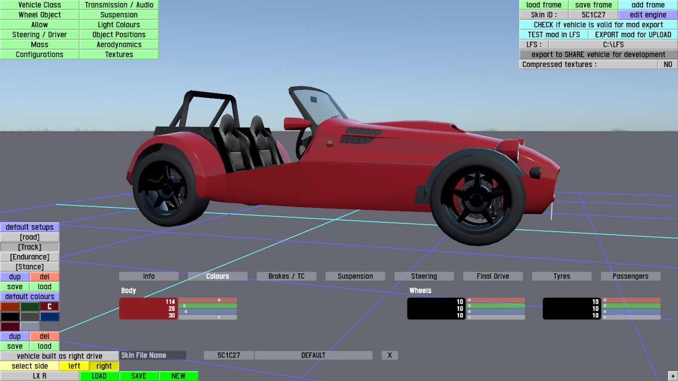 The LFS Vehicle editor provides options to create skin templates. A template helps you create skins for a vehicle by giving you the outlines of the vehicle's shape, within which you can draw the livery that will be drawn onto the vehicle.