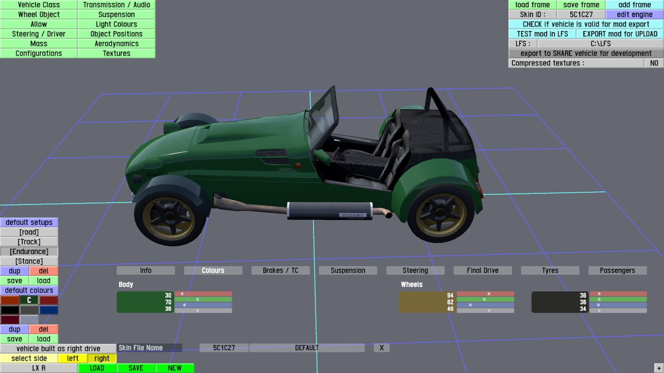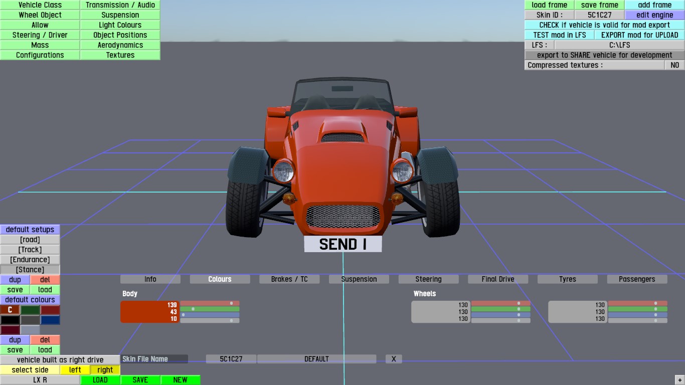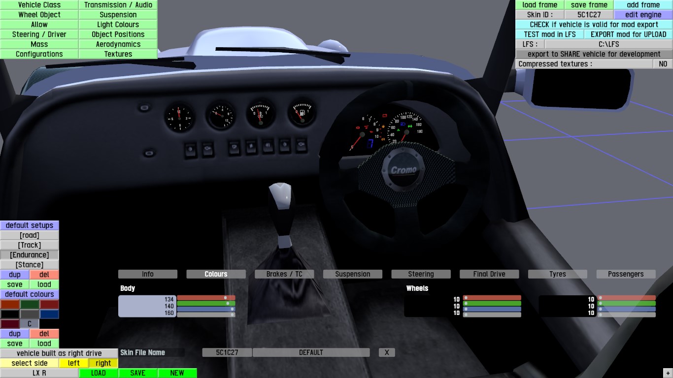 Introducing the LX R the r stands for race, its a WIP and i'm trying to make it better and apparently it veers side to side so that's something to work on. Its suppose to be a touring car with not so much HP, also there's a stance setup for cruises, and for the tires I selected its from normal to R4 tires, I had an idea of making it have hybrid and knobbleys but it didn't go well. As well as an endurance setup which involves R4's. Hope yall enjoy this mod as I further update it