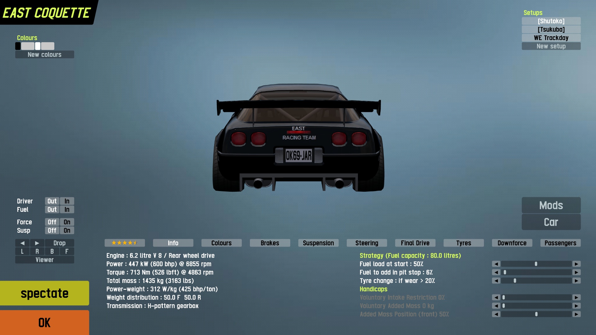 The engine is a bored-out TL-5 V8 that was enlarged from 5.7 liters to 6.2 liters generating 600hp with a 7500RPM redline. Plenty of aero to keep it planted on the road but it doesn't mean it won't break out sideways with careless throttle. Drivers beware, ABS is not present.