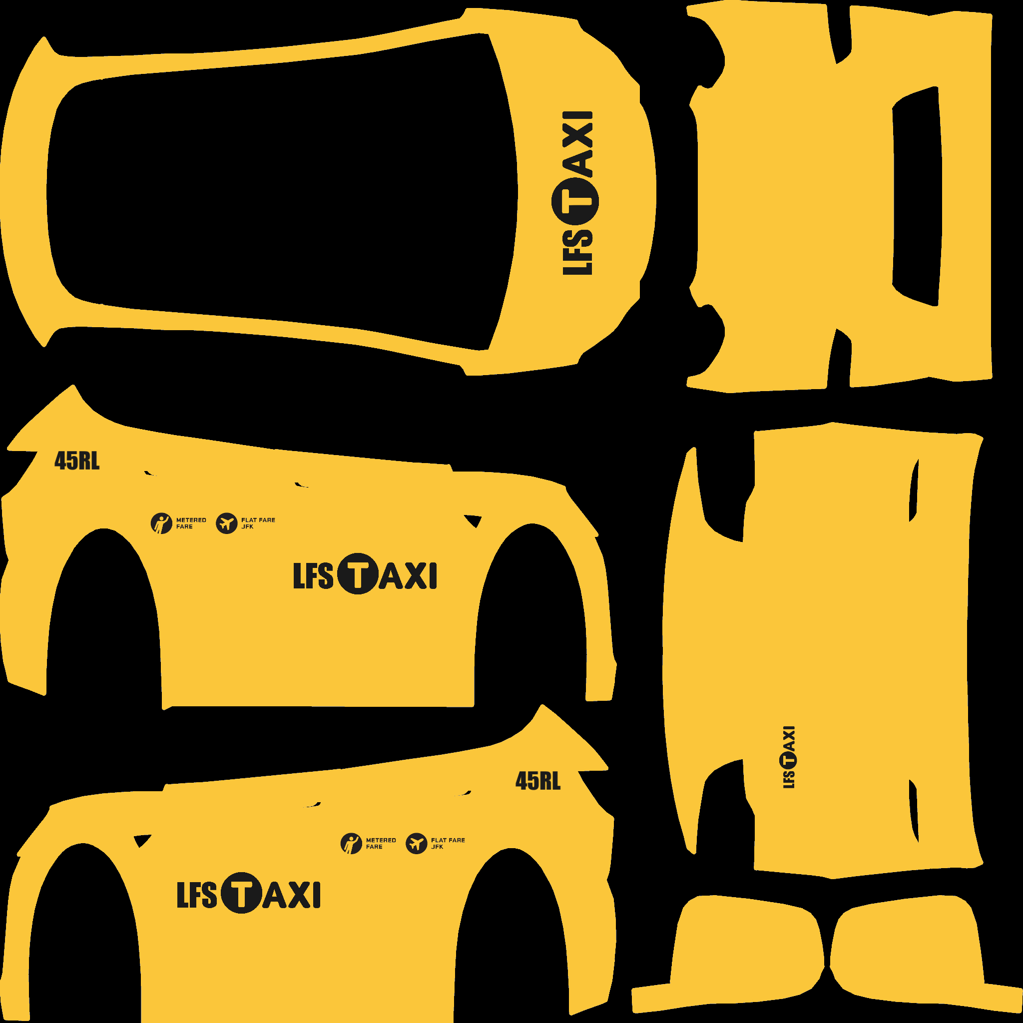 The LFS Vehicle editor provides options to create skin templates. A template helps you create skins for a vehicle by giving you the outlines of the vehicle's shape, within which you can draw the livery that will be drawn onto the vehicle.