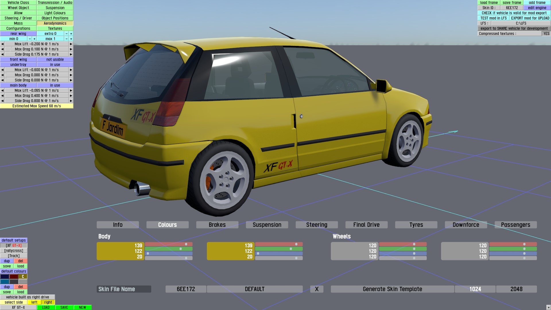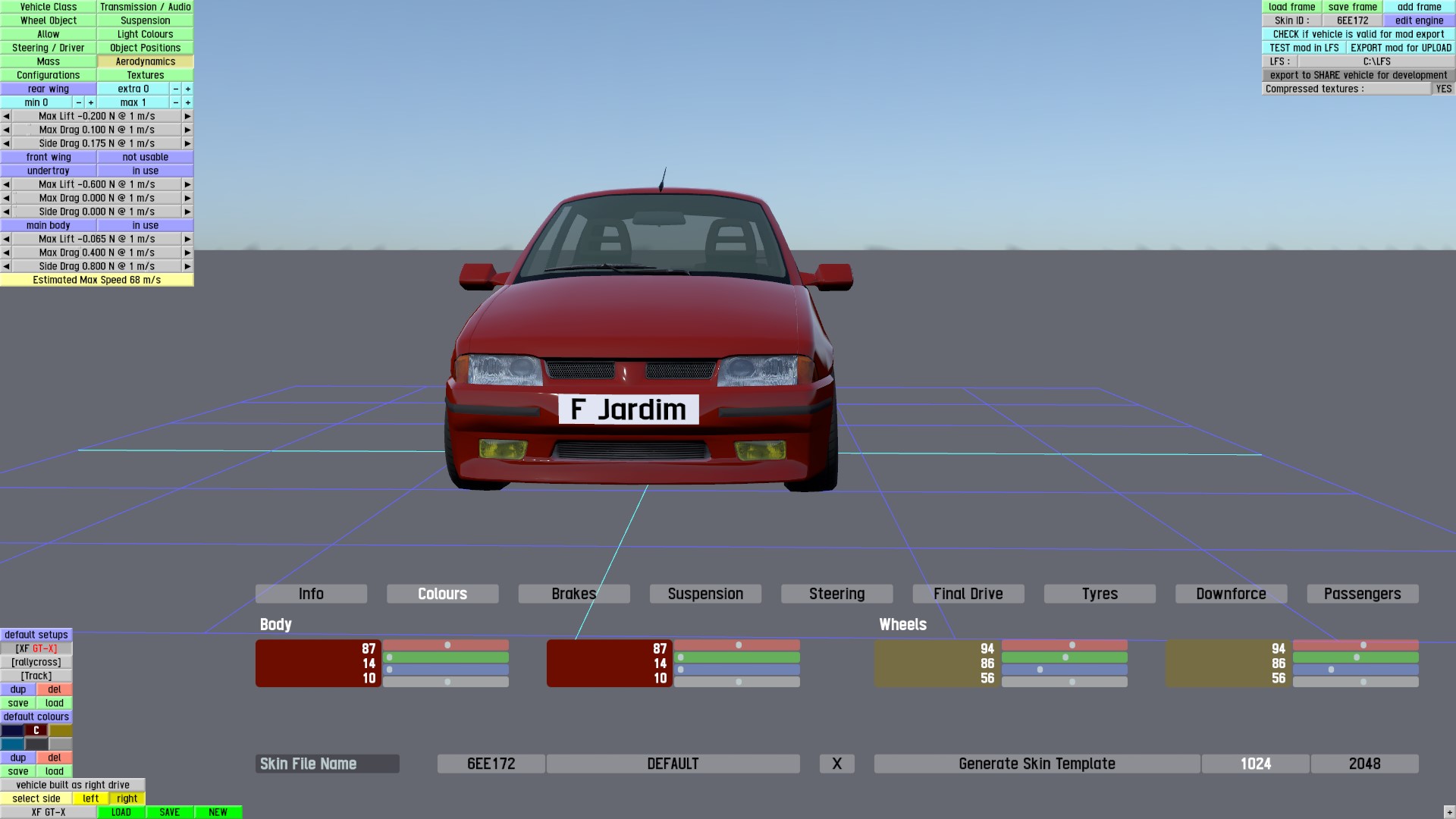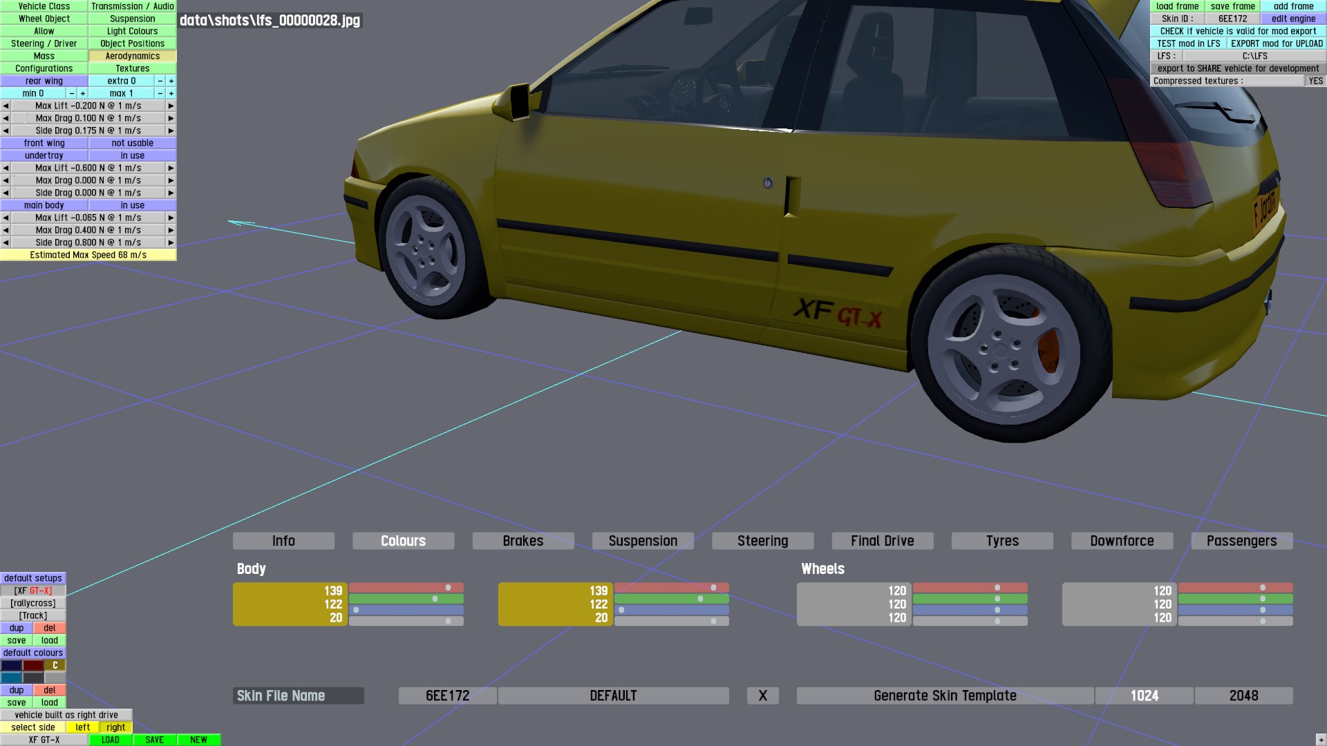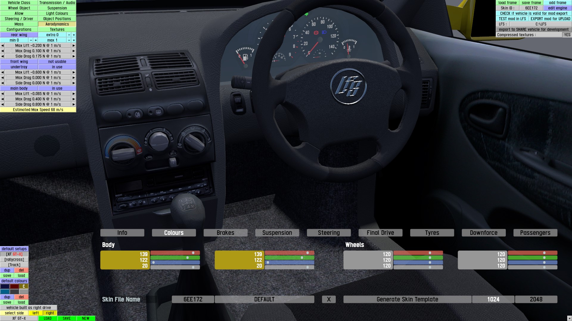 The LFS Vehicle editor provides options to create skin templates. A template helps you create skins for a vehicle by giving you the outlines of the vehicle's shape, within which you can draw the livery that will be drawn onto the vehicle.