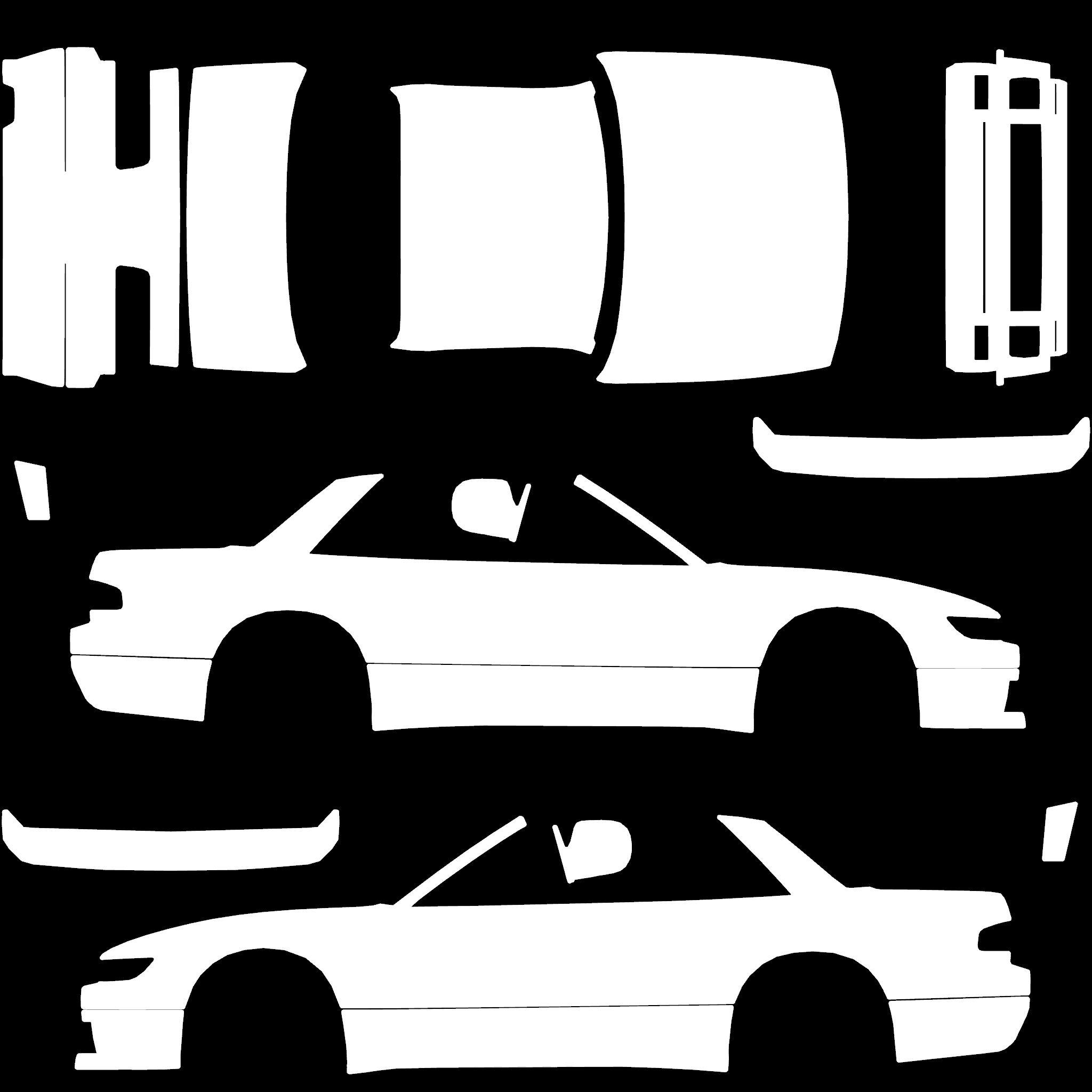 The LFS Vehicle editor provides options to create skin templates. A template helps you create skins for a vehicle by giving you the outlines of the vehicle's shape, within which you can draw the livery that will be drawn onto the vehicle.