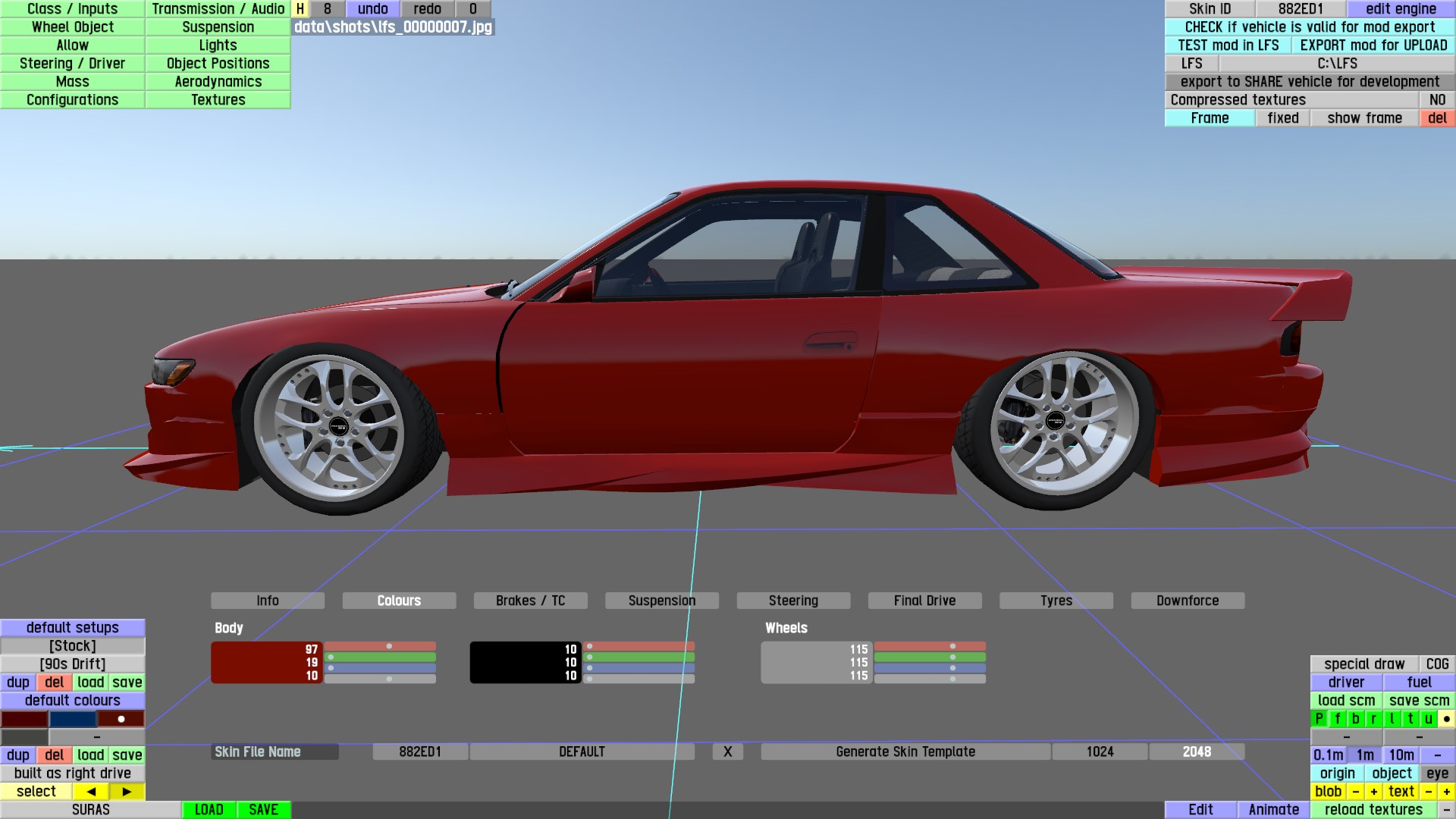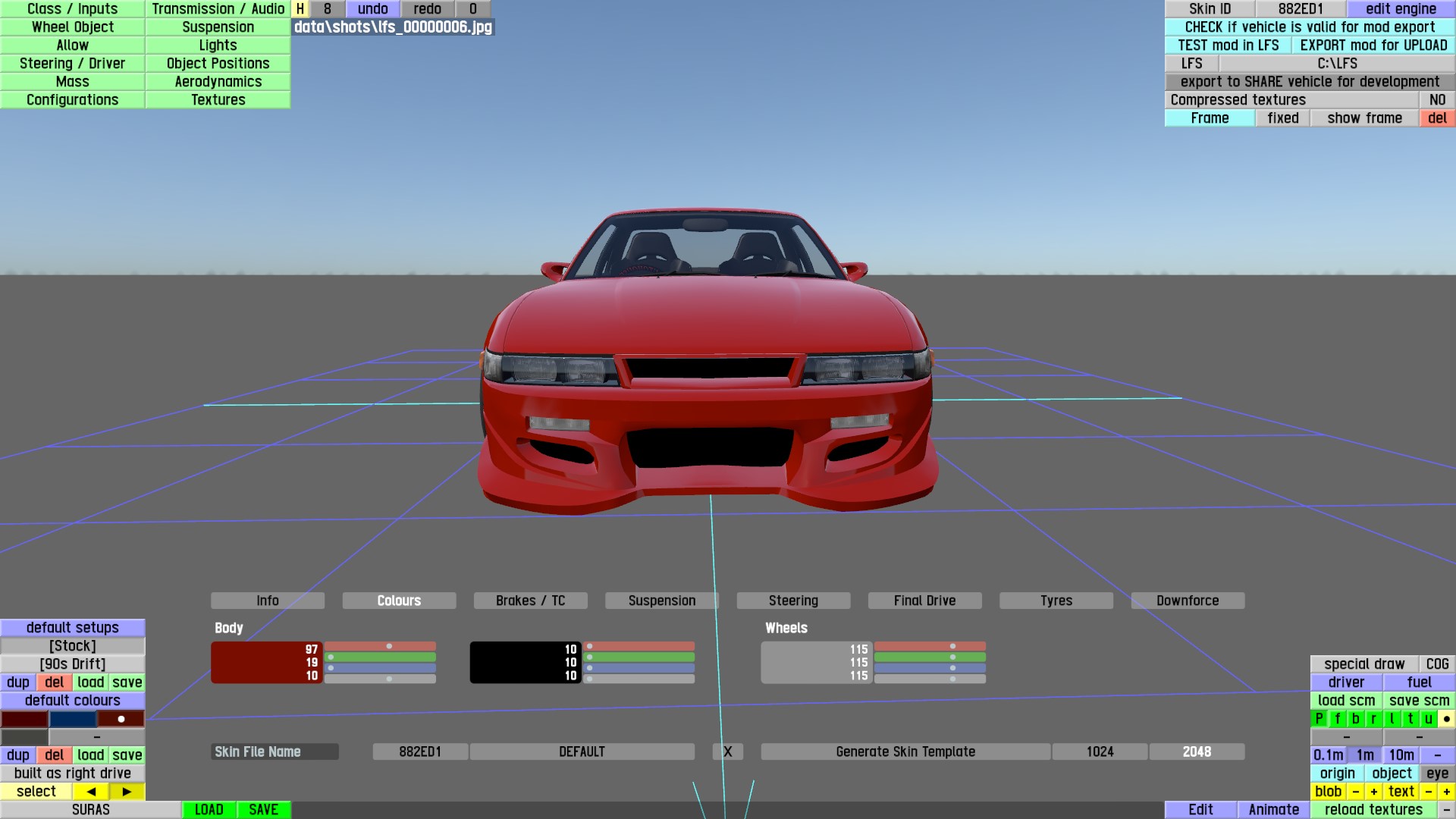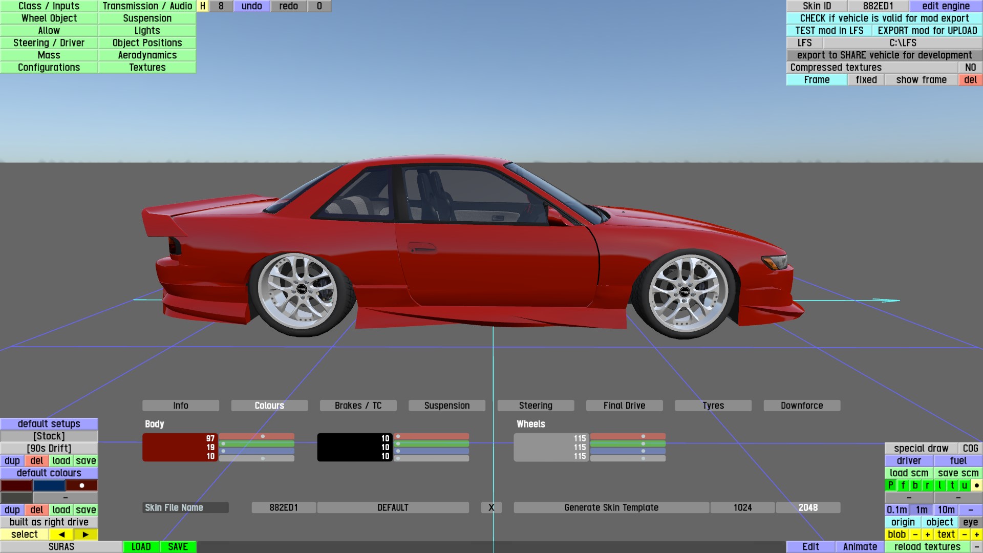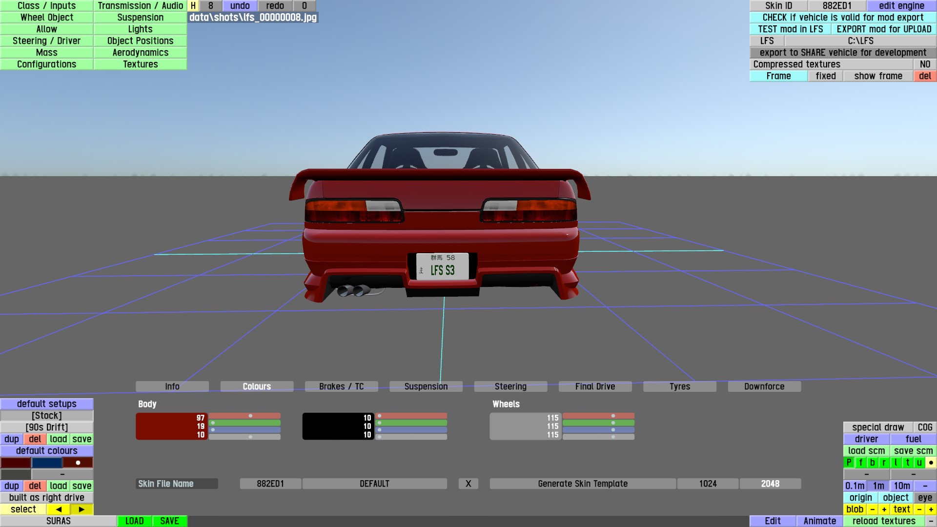 The LFS Vehicle editor provides options to create skin templates. A template helps you create skins for a vehicle by giving you the outlines of the vehicle's shape, within which you can draw the livery that will be drawn onto the vehicle.