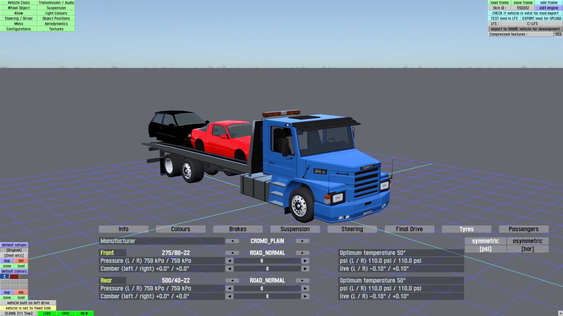 The LFS Vehicle editor provides options to create skin templates. A template helps you create skins for a vehicle by giving you the outlines of the vehicle's shape, within which you can draw the livery that will be drawn onto the vehicle.