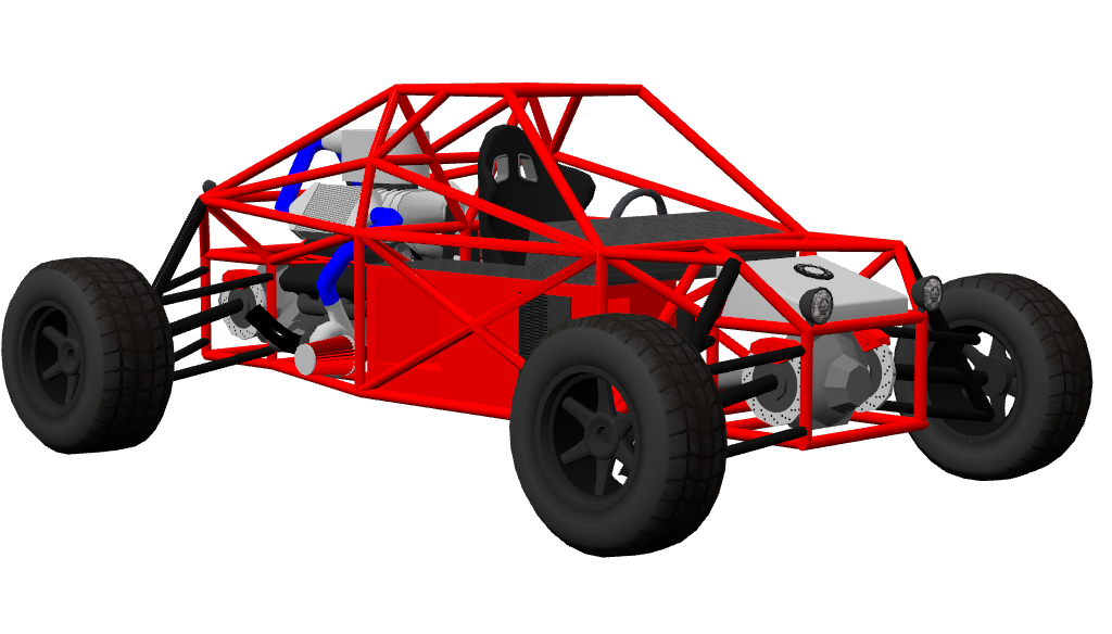 Rediculously overpowered AWD buggy with a 4.5 litre twincharged v8 making over 1000hp, having over 1:1 hp/kg even fully loaded. It has very long travel suspension that will soak up any jump you throw at it.