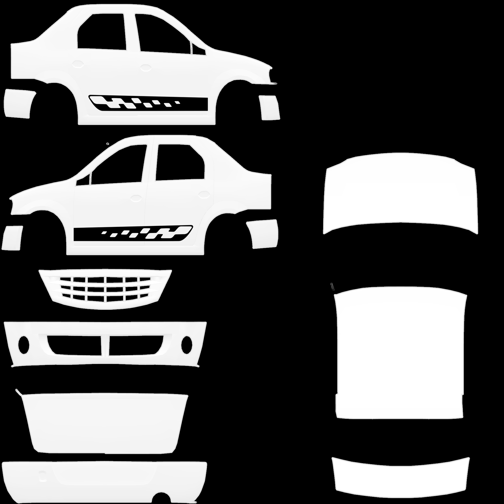The LFS Vehicle editor provides options to create skin templates. A template helps you create skins for a vehicle by giving you the outlines of the vehicle's shape, within which you can draw the livery that will be drawn onto the vehicle.