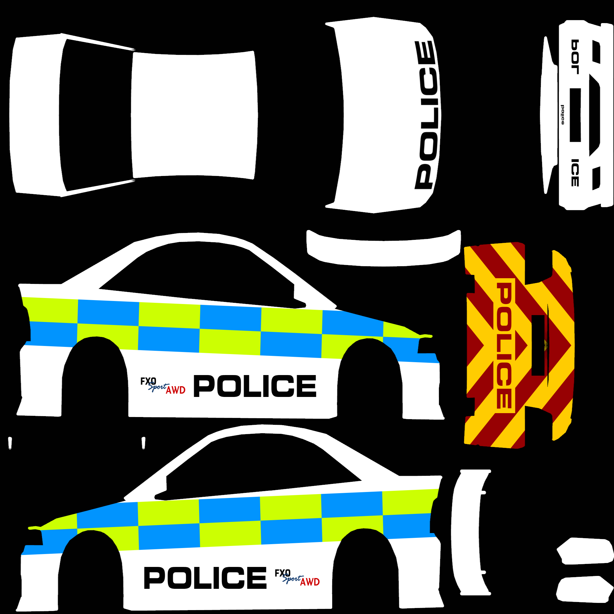 The LFS Vehicle editor provides options to create skin templates. A template helps you create skins for a vehicle by giving you the outlines of the vehicle's shape, within which you can draw the livery that will be drawn onto the vehicle.