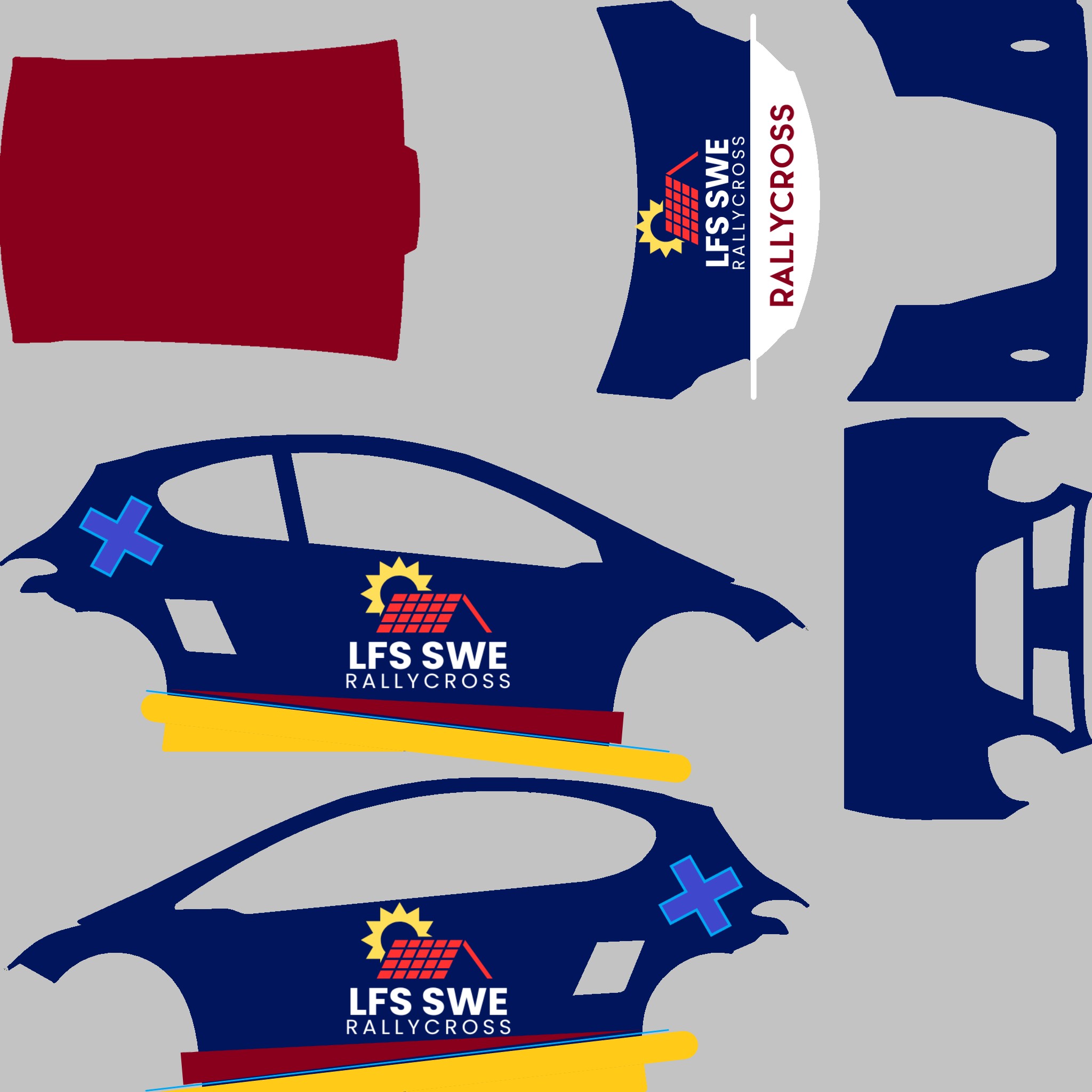The LFS Vehicle editor provides options to create skin templates. A template helps you create skins for a vehicle by giving you the outlines of the vehicle's shape, within which you can draw the livery that will be drawn onto the vehicle.