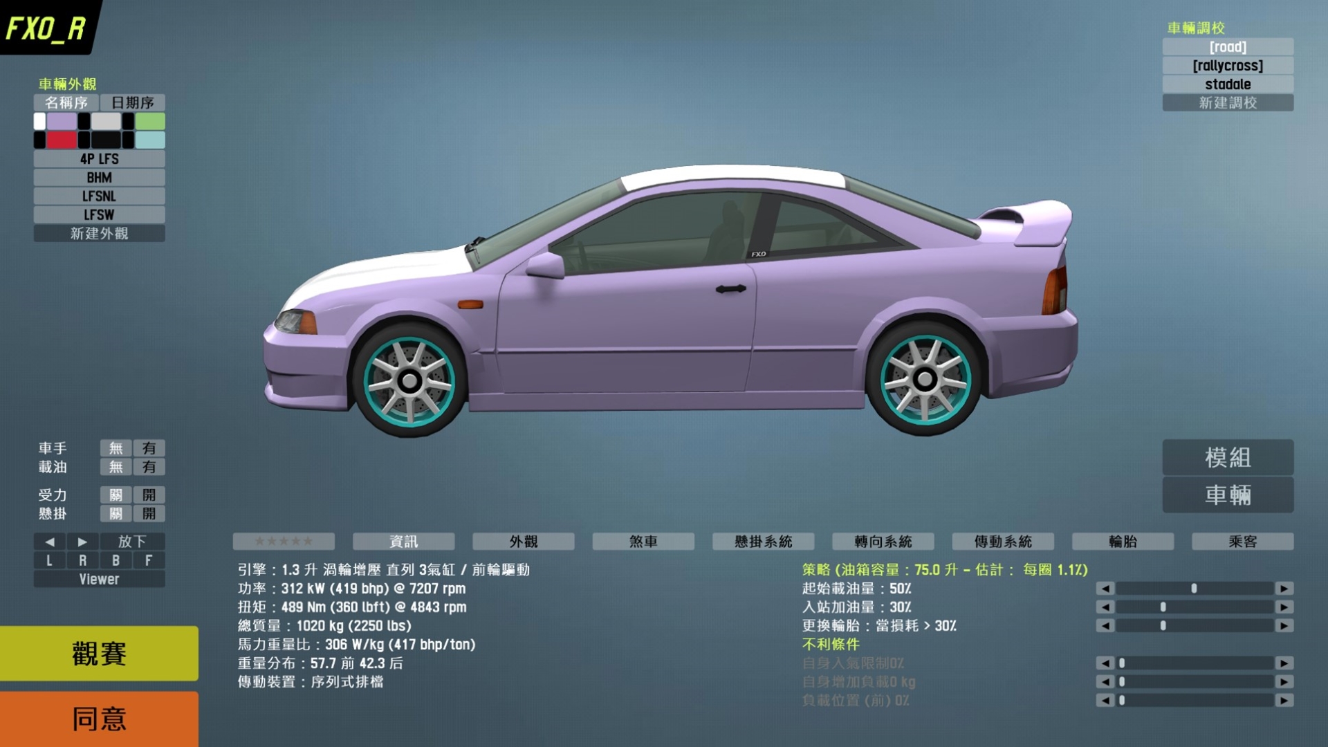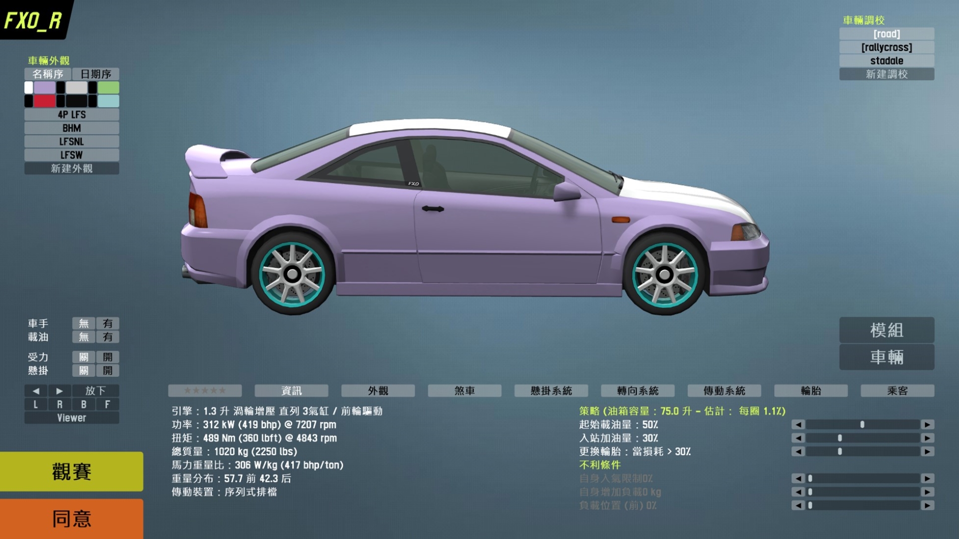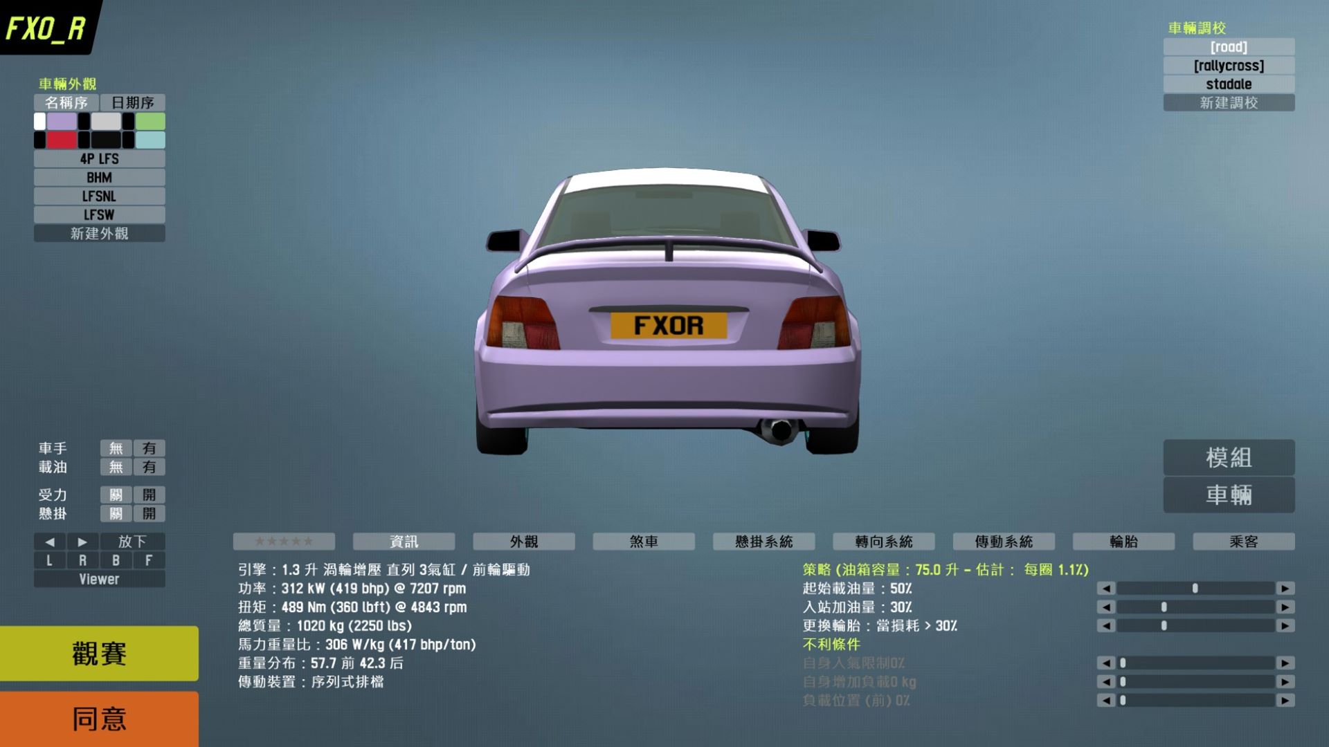 Western Mechanics and Electronics has recently developed what could be regarded as the most technologically advanced racing engine in the world - a 1.3 liter 3-cylinder engine that gives 419 bhp and 489 Nm, and revs up to around 9000 rpm for its redline with around 2 bar of turbo pressure. Despite the extreme output, the engine is smaller in weight than the engines found in normal-spec FXOs, meaning that the weight of the car is hardly disadvantaged. Staying true to the FXO's street-derived roots, WME has not made much changes to the car's general setup or interior detail, ensuring that no road-comfort is sacrificed in the tuning.