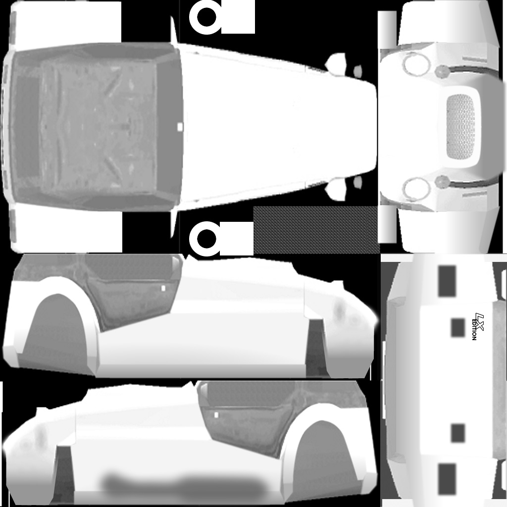 The LFS Vehicle editor provides options to create skin templates. A template helps you create skins for a vehicle by giving you the outlines of the vehicle's shape, within which you can draw the livery that will be drawn onto the vehicle.