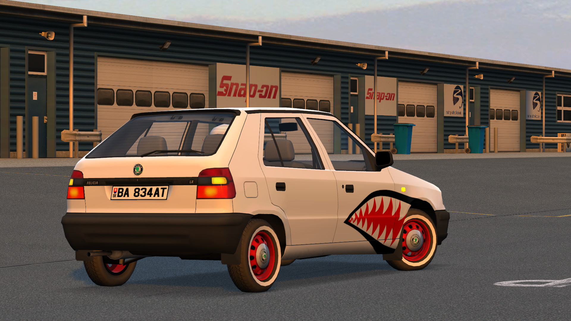 This mod is a tribute to my first car, the 1997 Škoda Felicia LX. It was a basic entry-level model (quite spartan) and it did not have power-steering, ABS and a front sway bar in a comparison to better-equipped Felicias. A basic engine was quite underpowered but the communicative chassis exaggerated the sensation of speed in a very enjoyable way. Thanks to a low weight (and absence of the front sway bar) the car was ideal for dirt roads and even for mild off-roading. Despite high body-roll, the steering was communicative and precise. A rear inner wheel used to lift up in the air on the limit (which was quite scary), but the car always remained predictable (and surprisingly agile with a set of good tires).