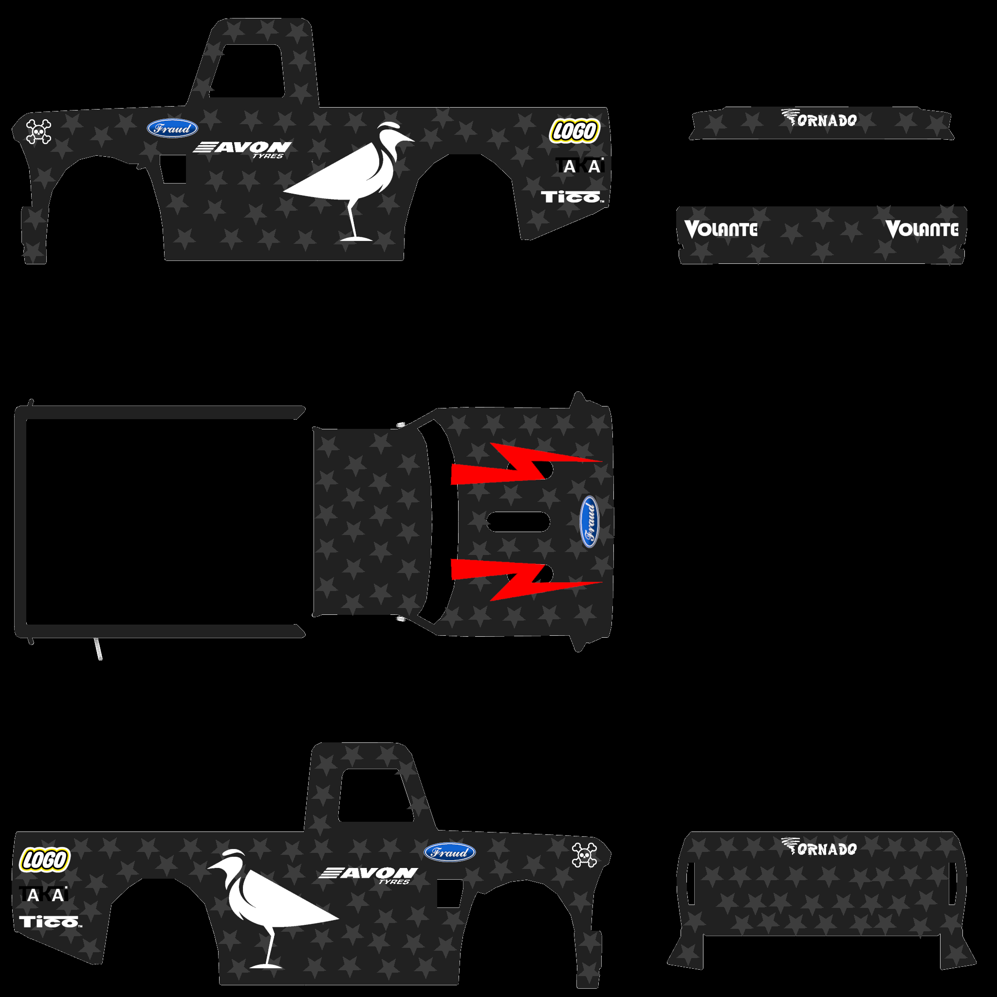 The LFS Vehicle editor provides options to create skin templates. A template helps you create skins for a vehicle by giving you the outlines of the vehicle's shape, within which you can draw the livery that will be drawn onto the vehicle.