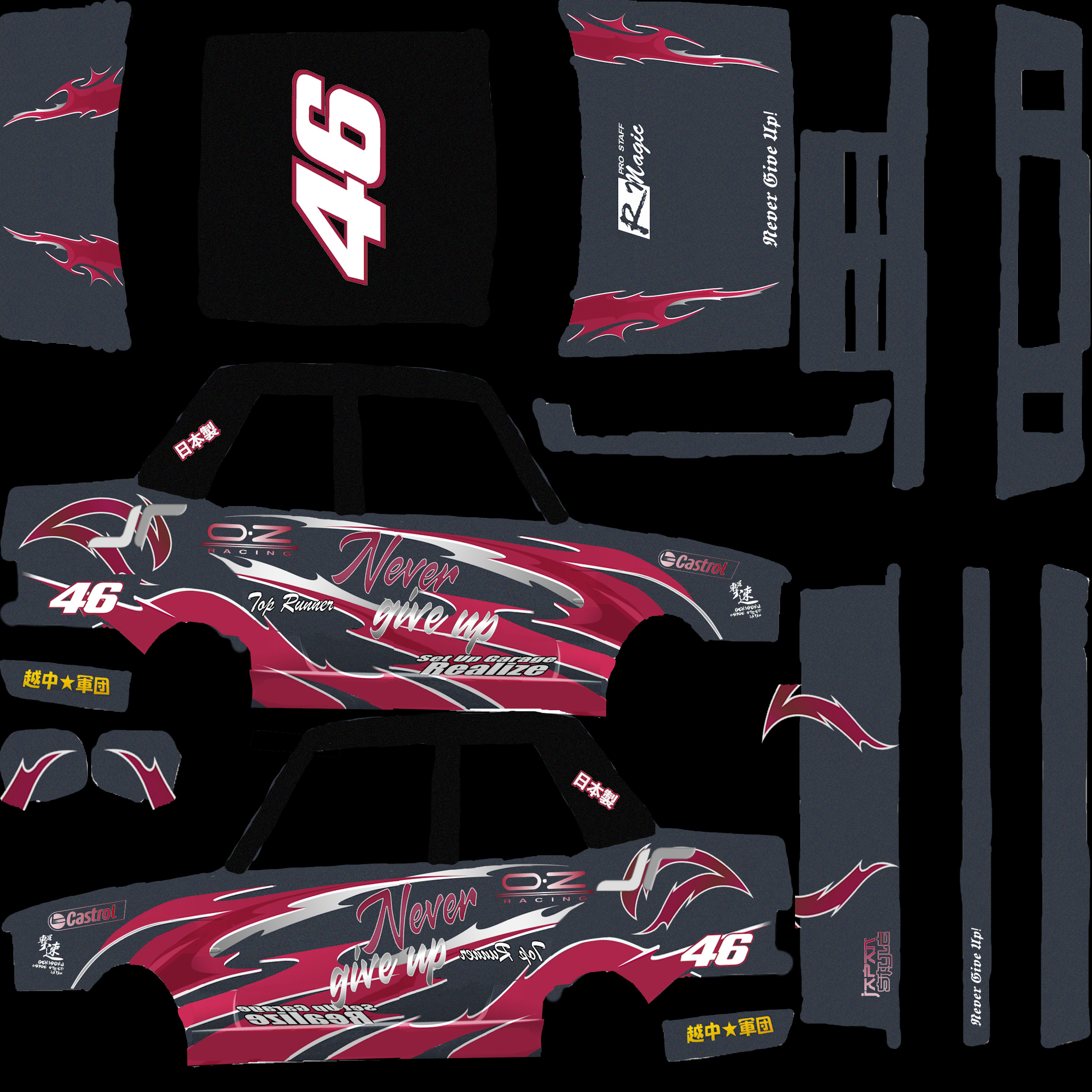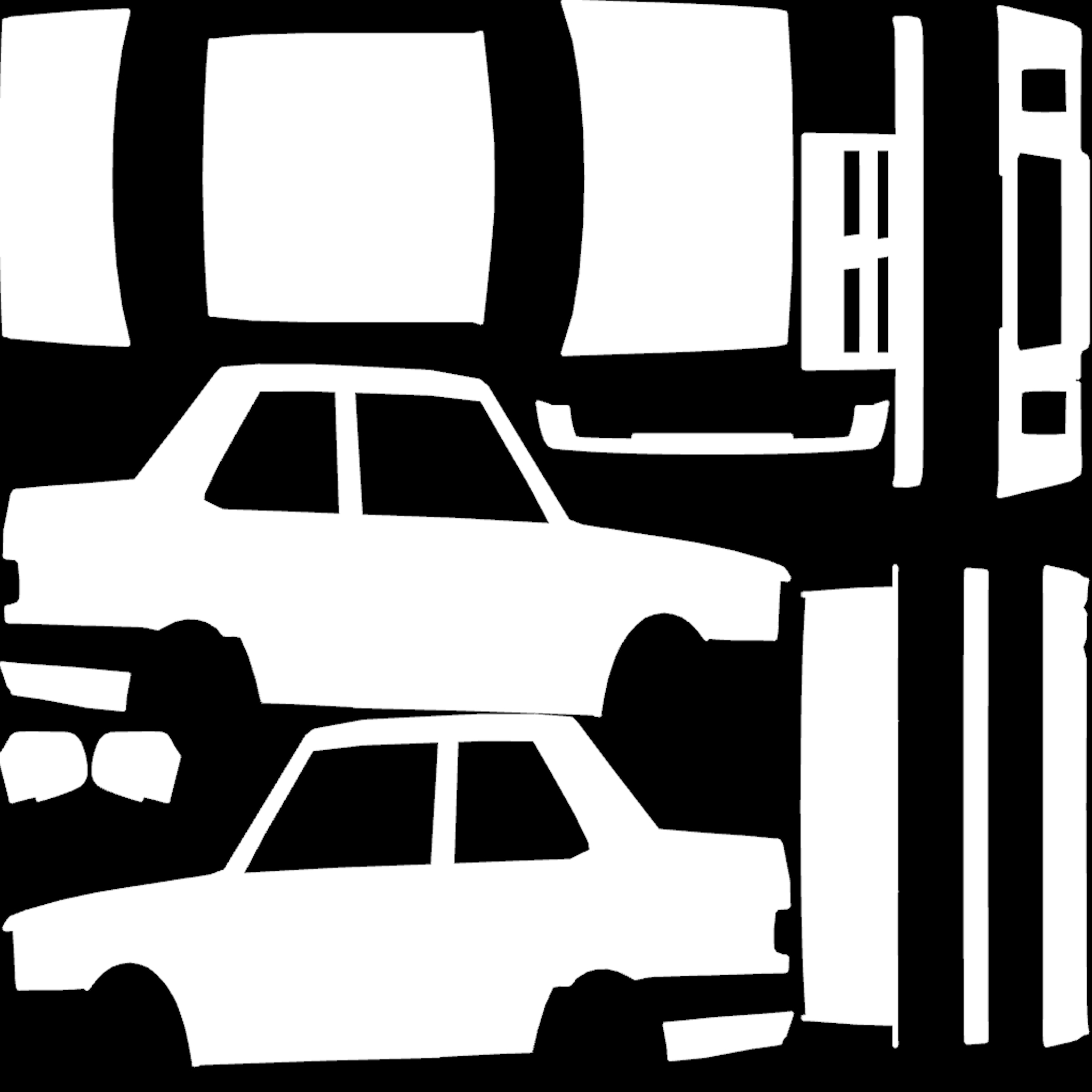 The LFS Vehicle editor provides options to create skin templates. A template helps you create skins for a vehicle by giving you the outlines of the vehicle's shape, within which you can draw the livery that will be drawn onto the vehicle.