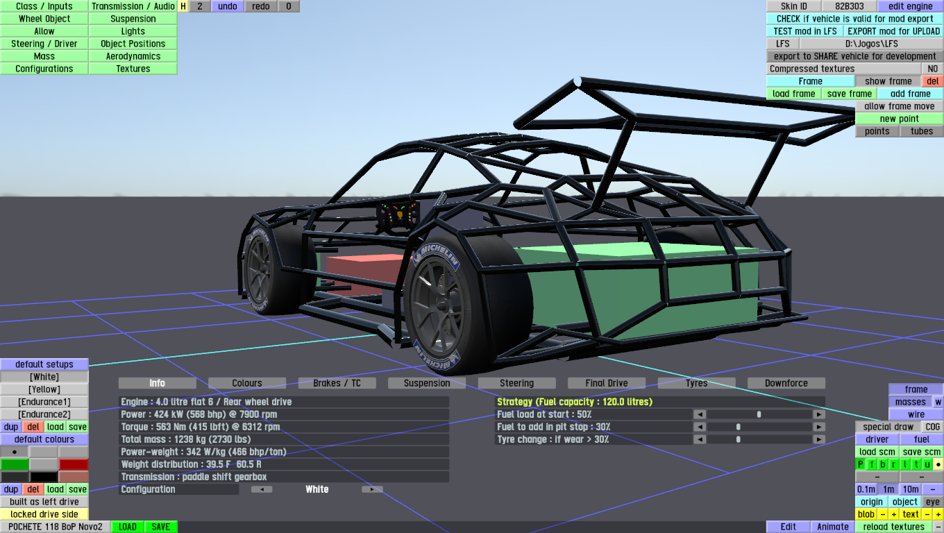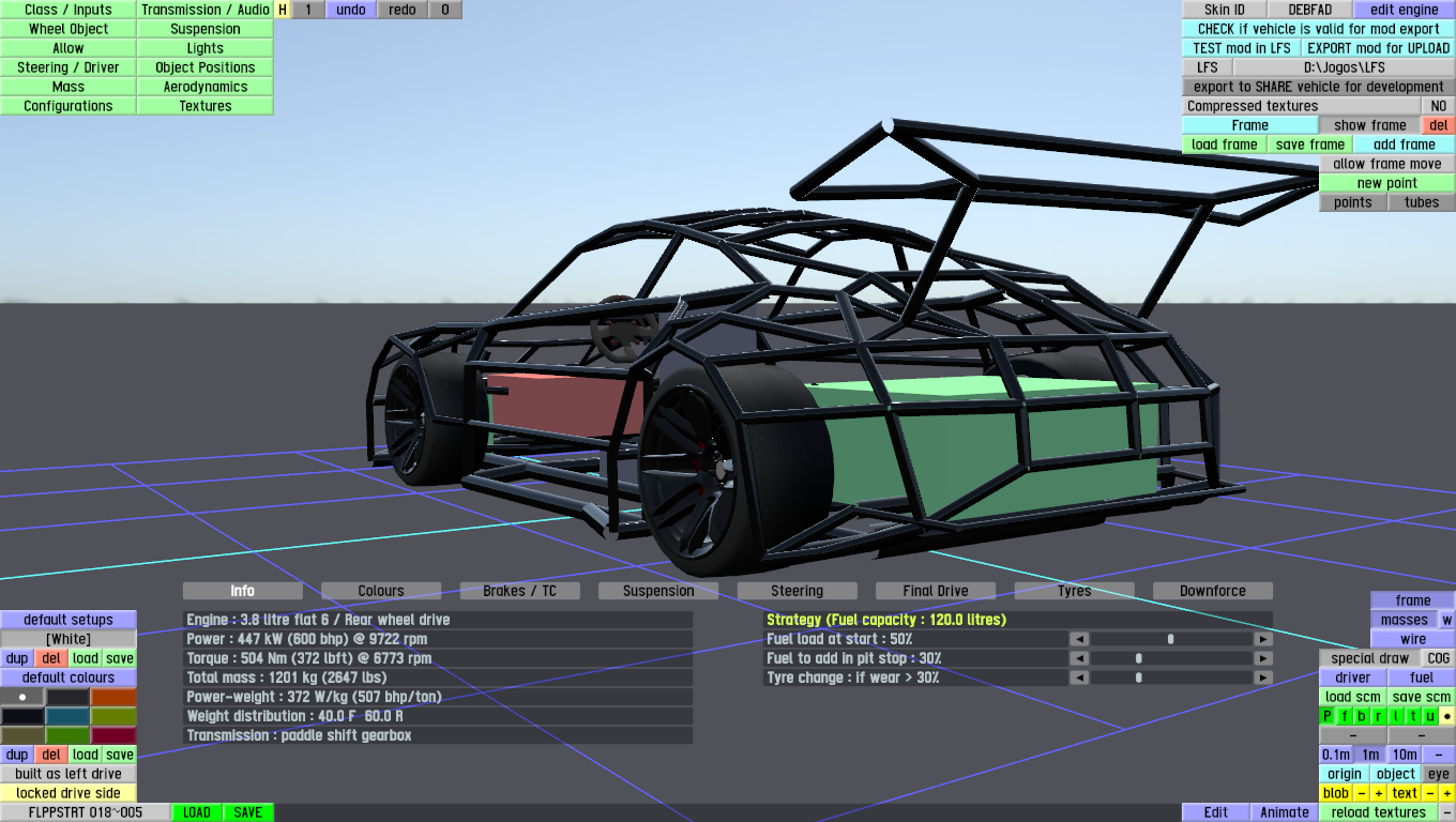 The LFS Vehicle editor provides options to create skin templates. A template helps you create skins for a vehicle by giving you the outlines of the vehicle's shape, within which you can draw the livery that will be drawn onto the vehicle.