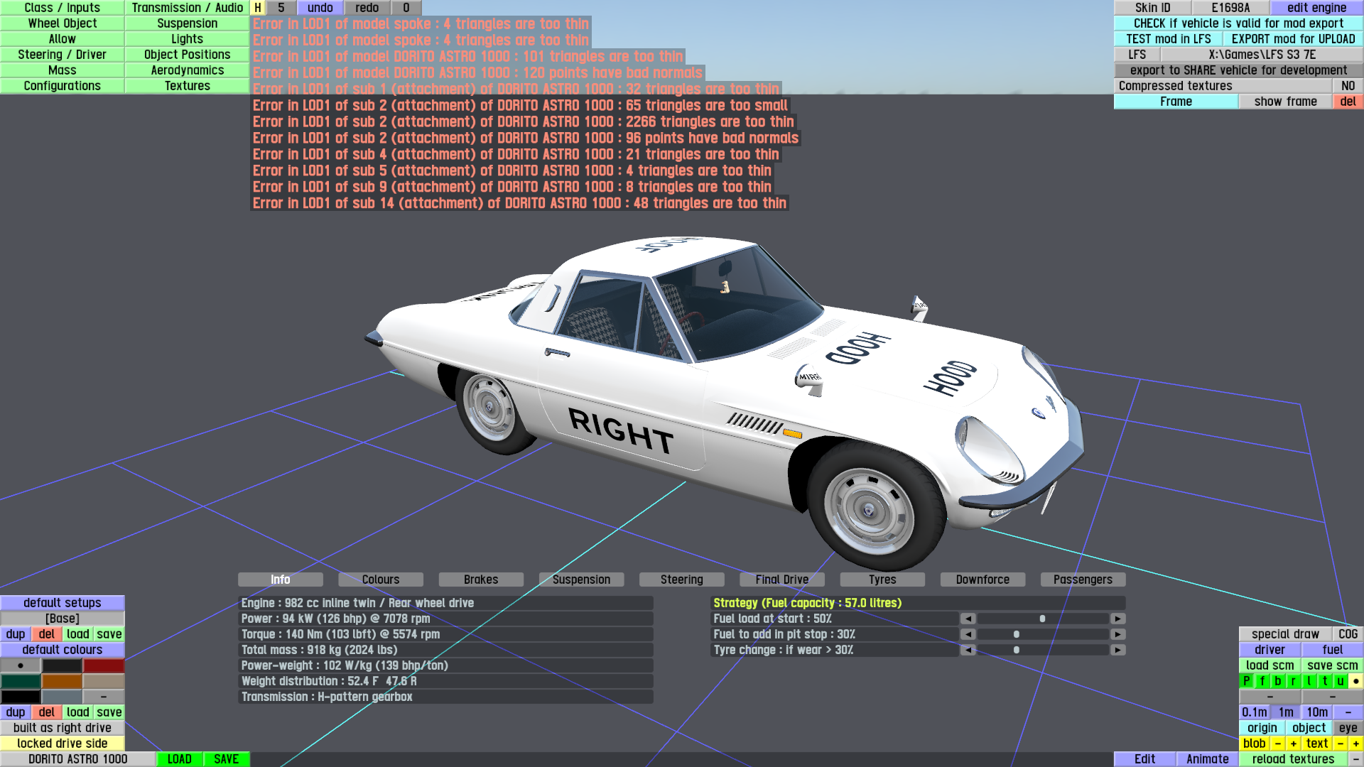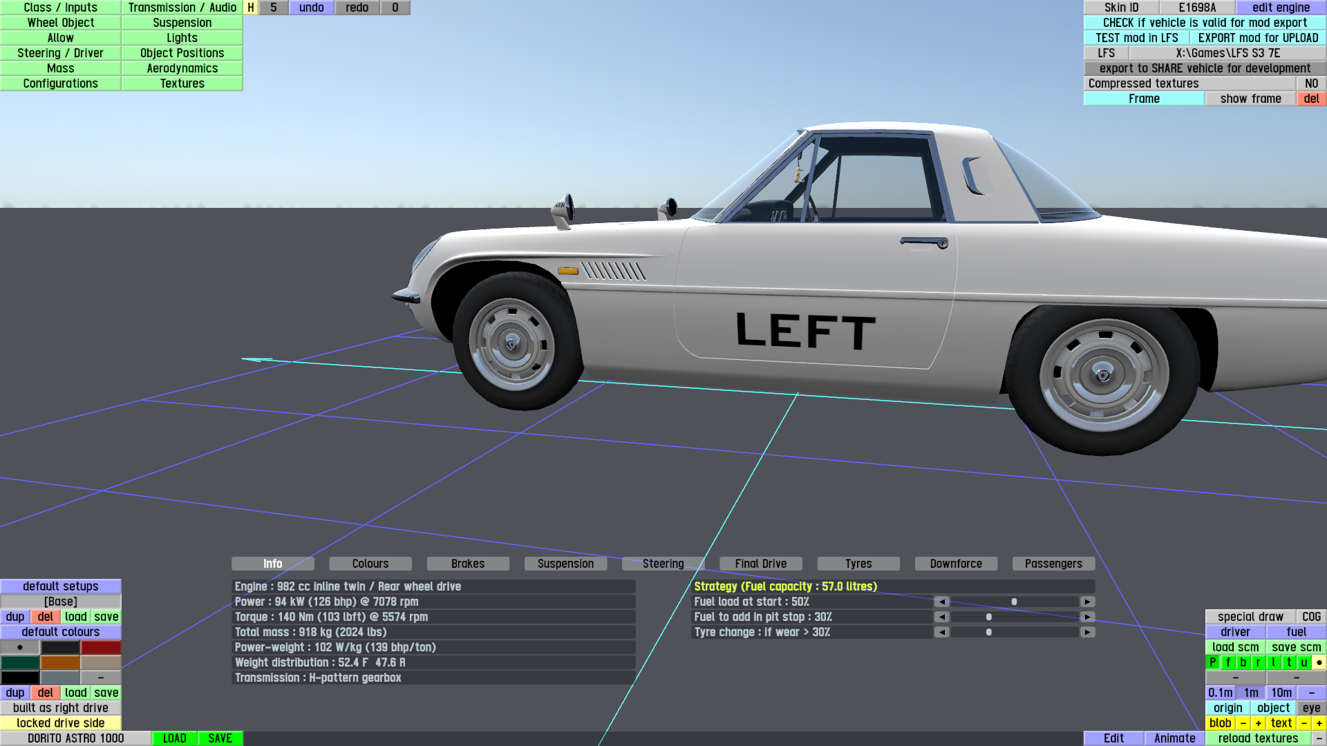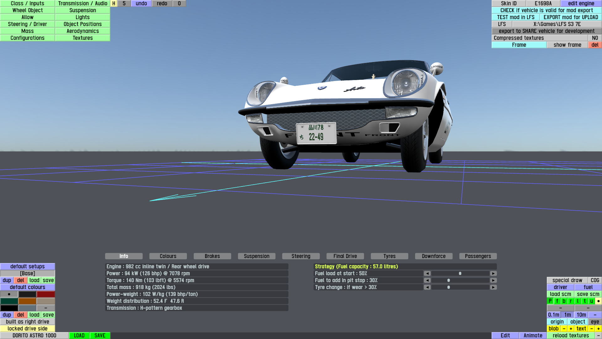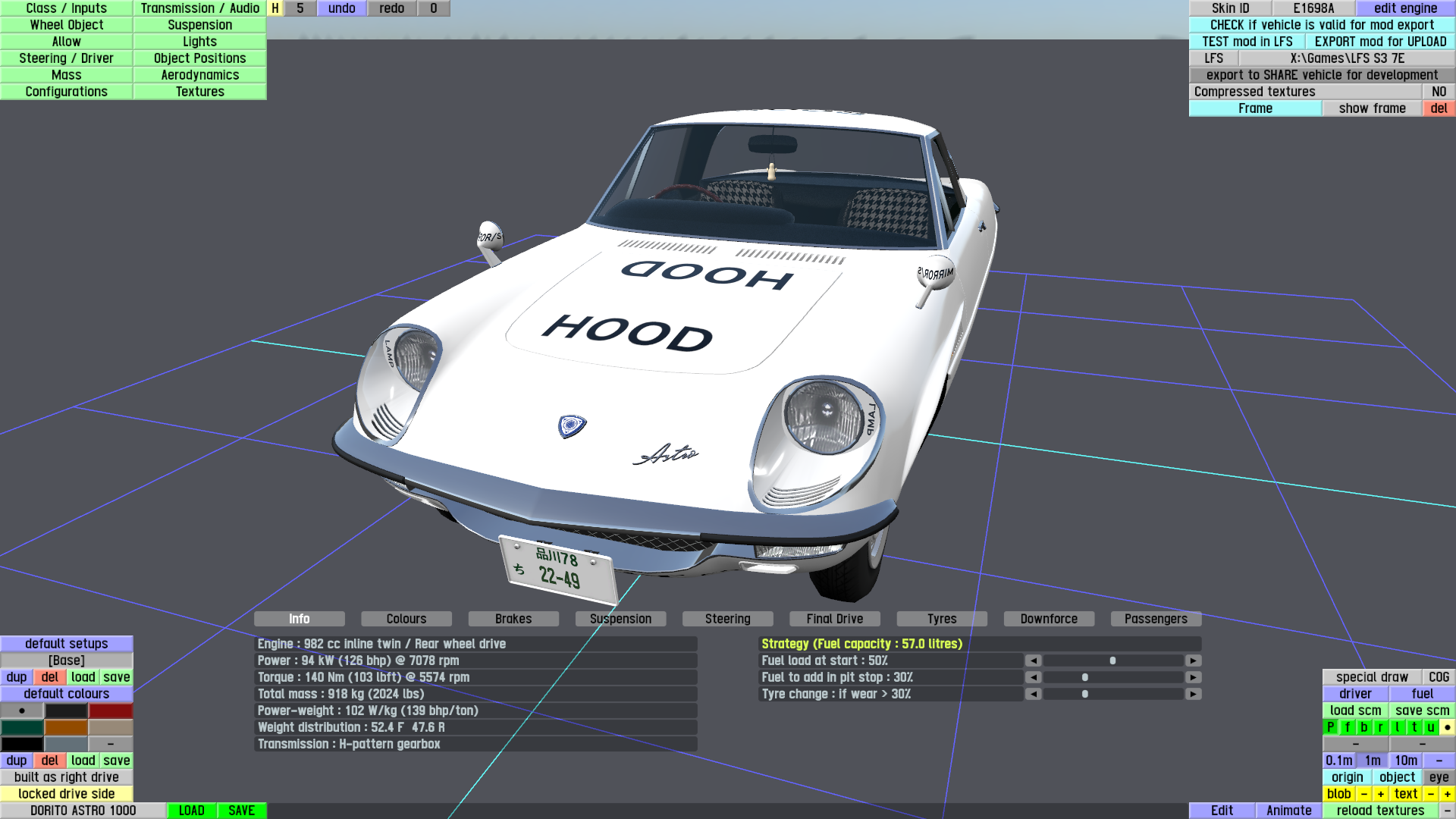 The LFS Vehicle editor provides options to create skin templates. A template helps you create skins for a vehicle by giving you the outlines of the vehicle's shape, within which you can draw the livery that will be drawn onto the vehicle.