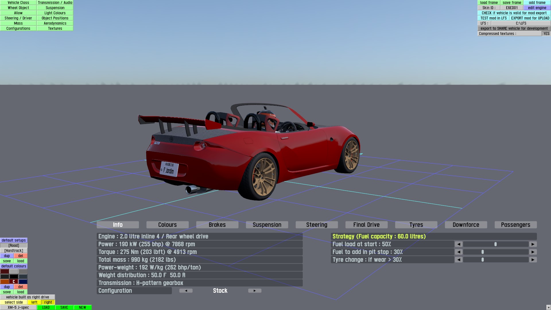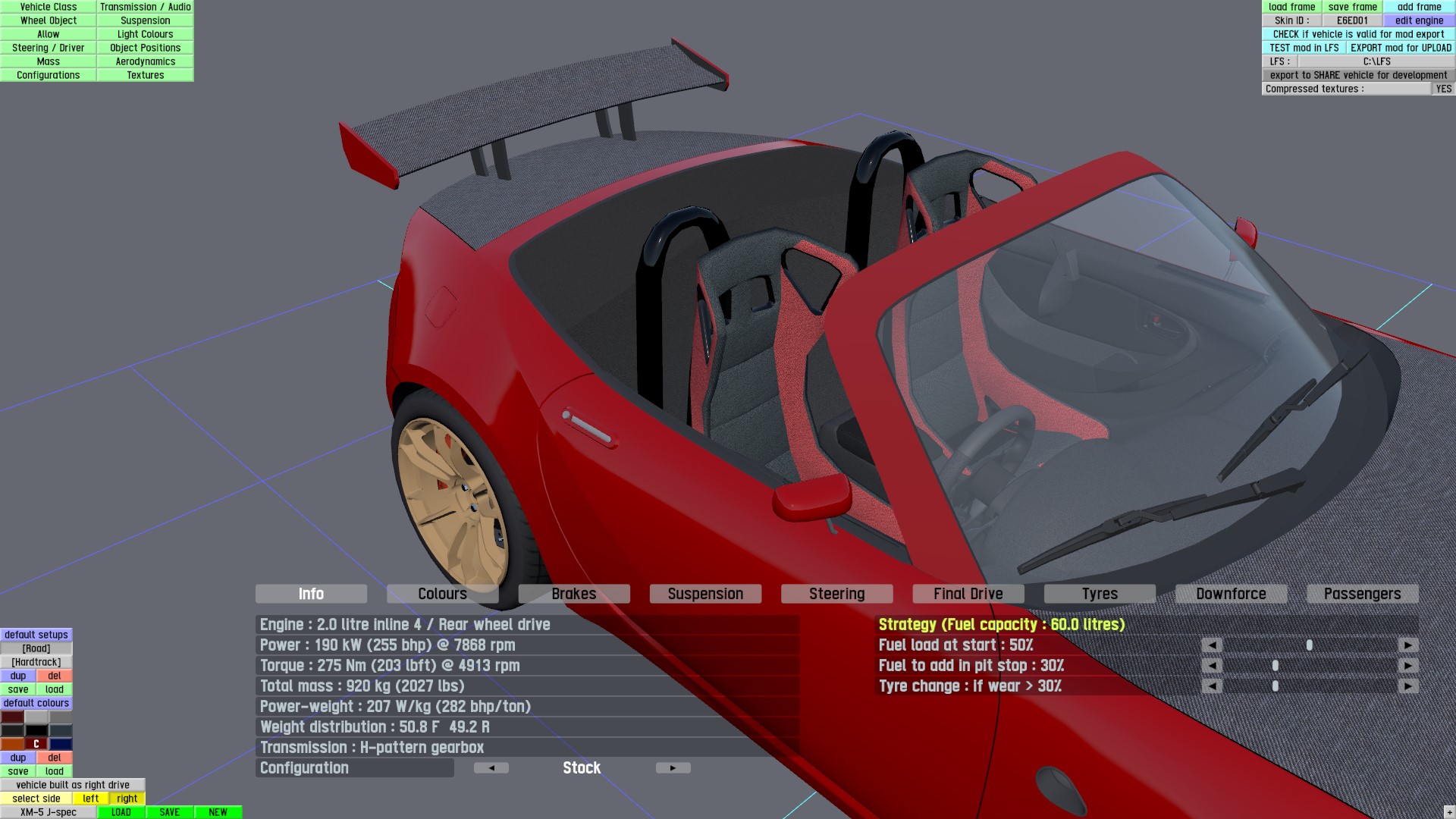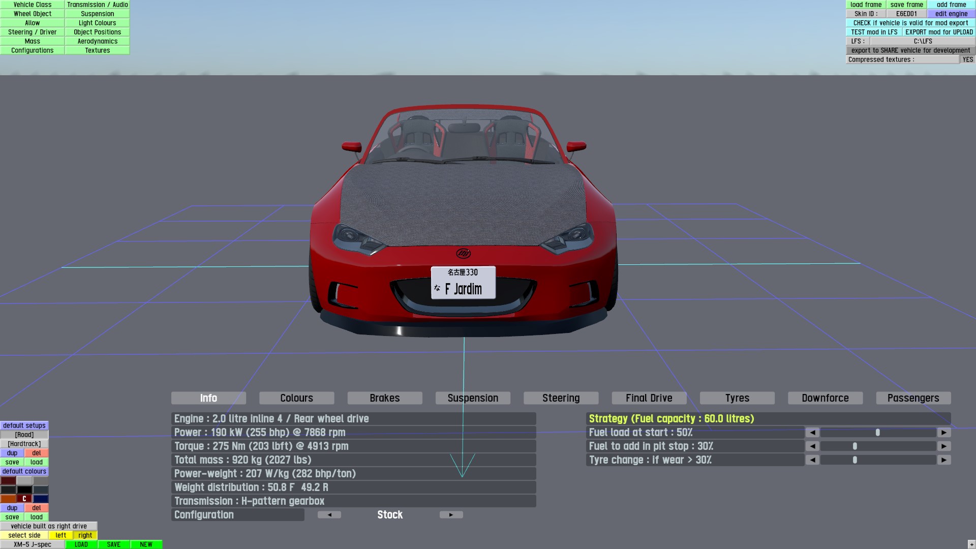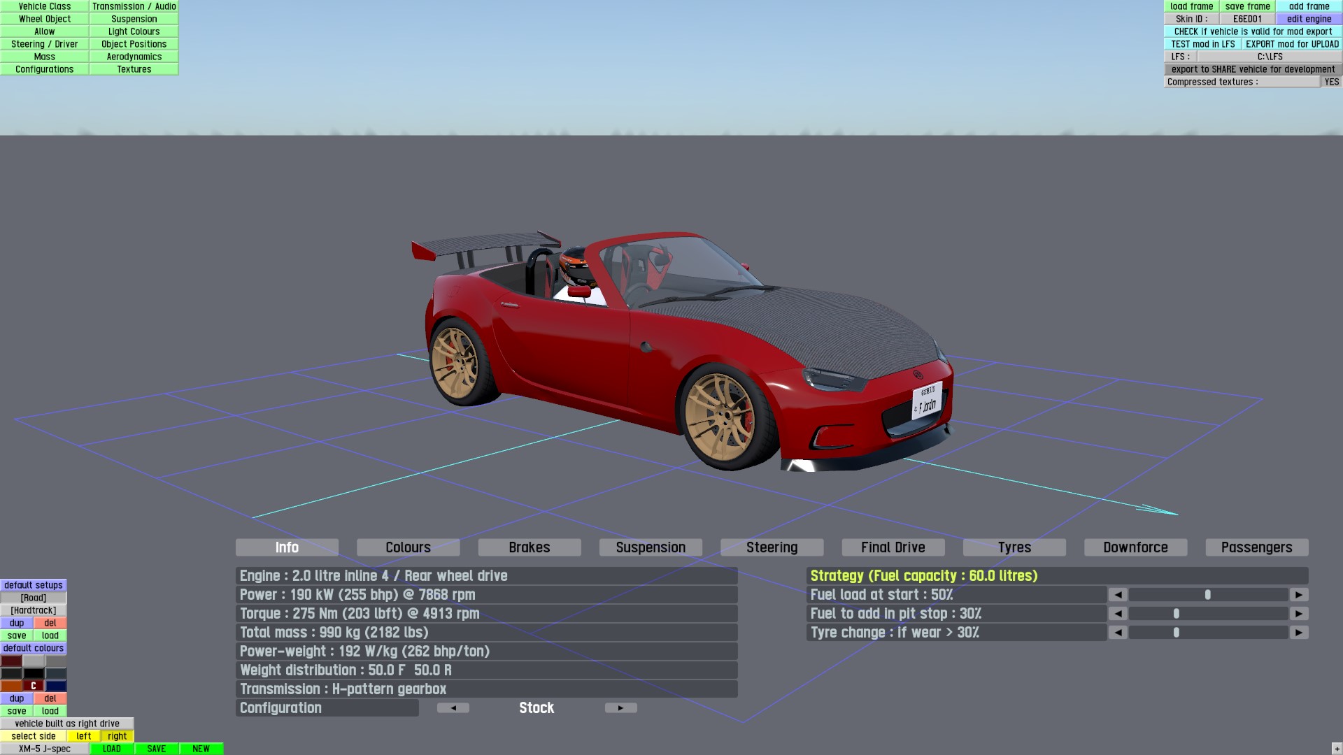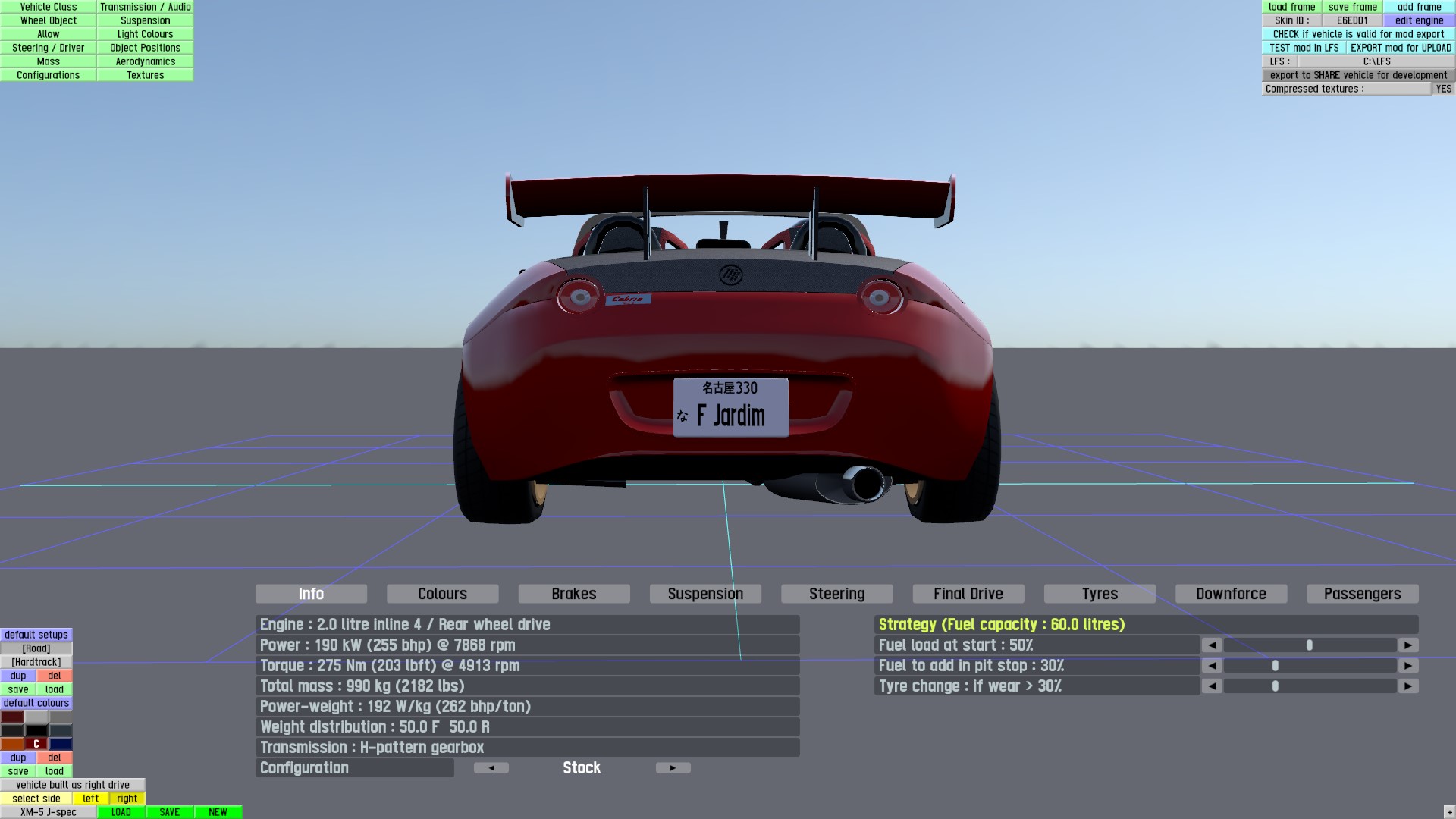 Standard engine reworked with high lift cams, 5 angle valve job with increase in port size and polish, race exhaust and individual throttle bodies, Tuned on E85 to deliver 255 naturally aspirated horsepower. front lip and rear GT wing for downforce. Carbon parts used to 120kg total. Wide tires for optimal grip. Made to compete with a standard FZ5