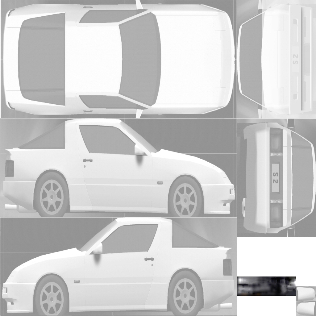 The LFS Vehicle editor provides options to create skin templates. A template helps you create skins for a vehicle by giving you the outlines of the vehicle's shape, within which you can draw the livery that will be drawn onto the vehicle.