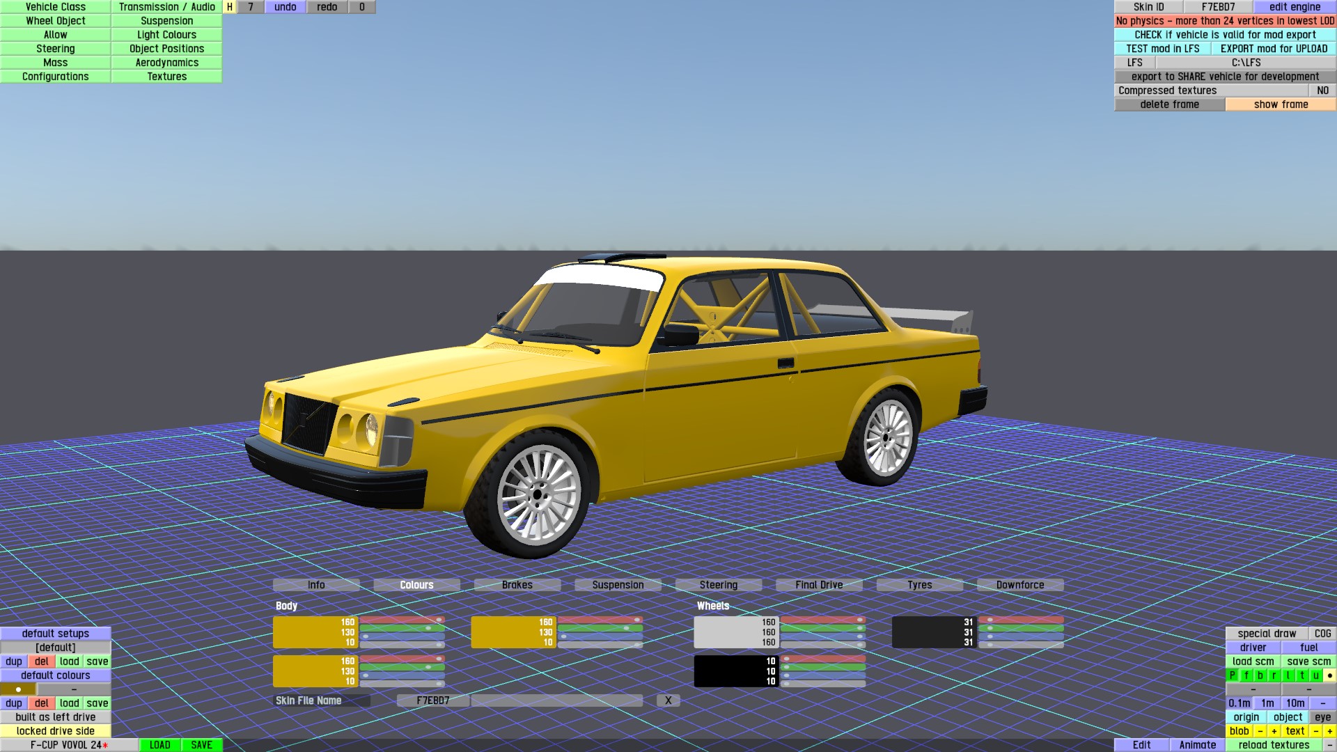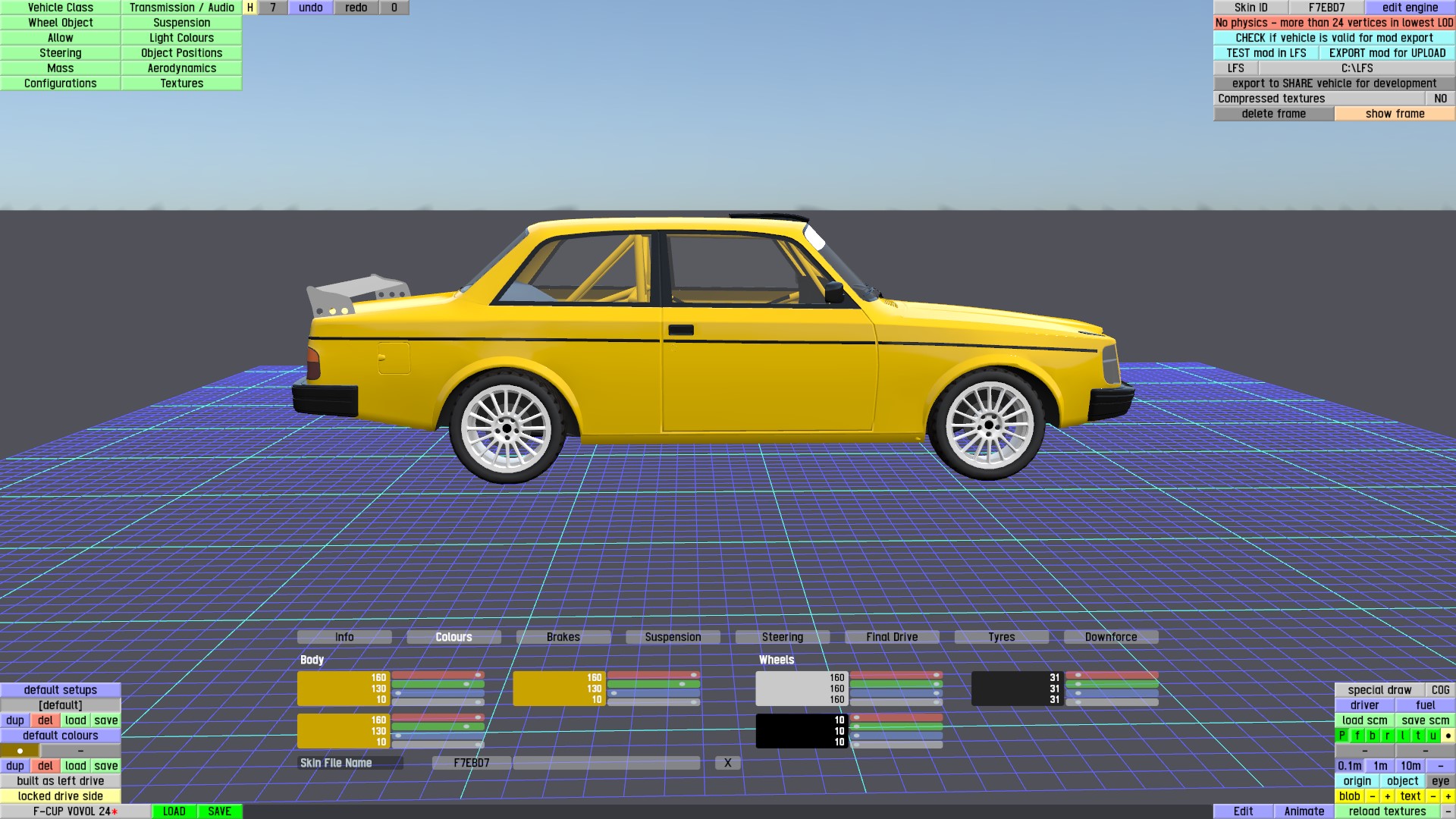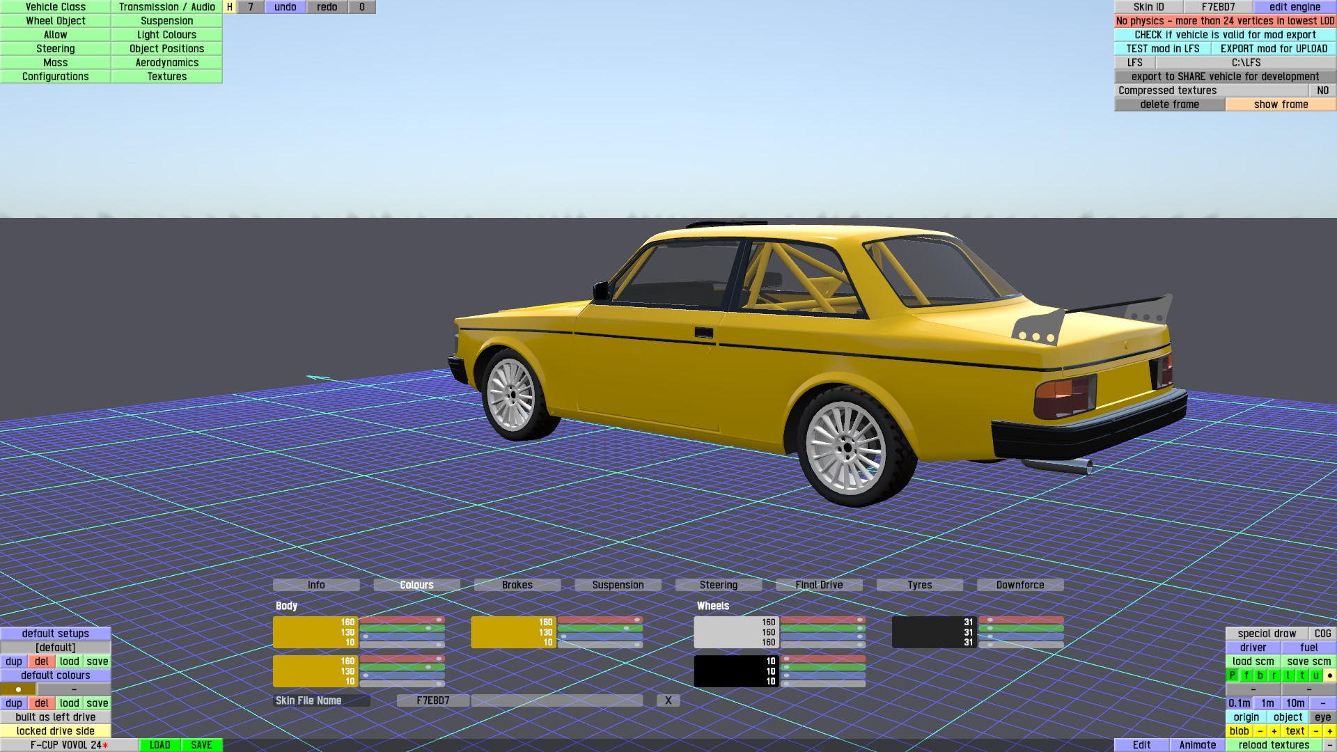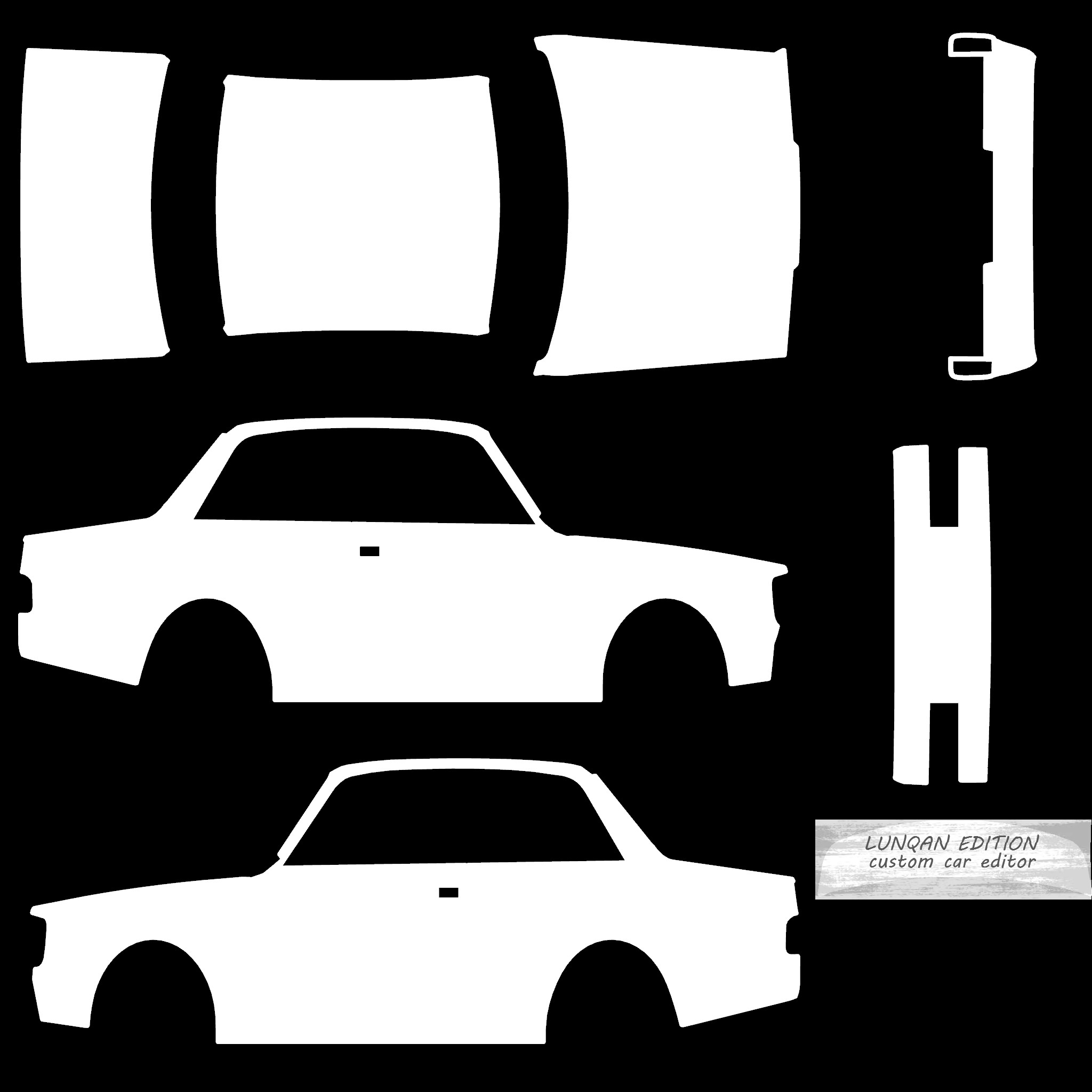 The LFS Vehicle editor provides options to create skin templates. A template helps you create skins for a vehicle by giving you the outlines of the vehicle's shape, within which you can draw the livery that will be drawn onto the vehicle.