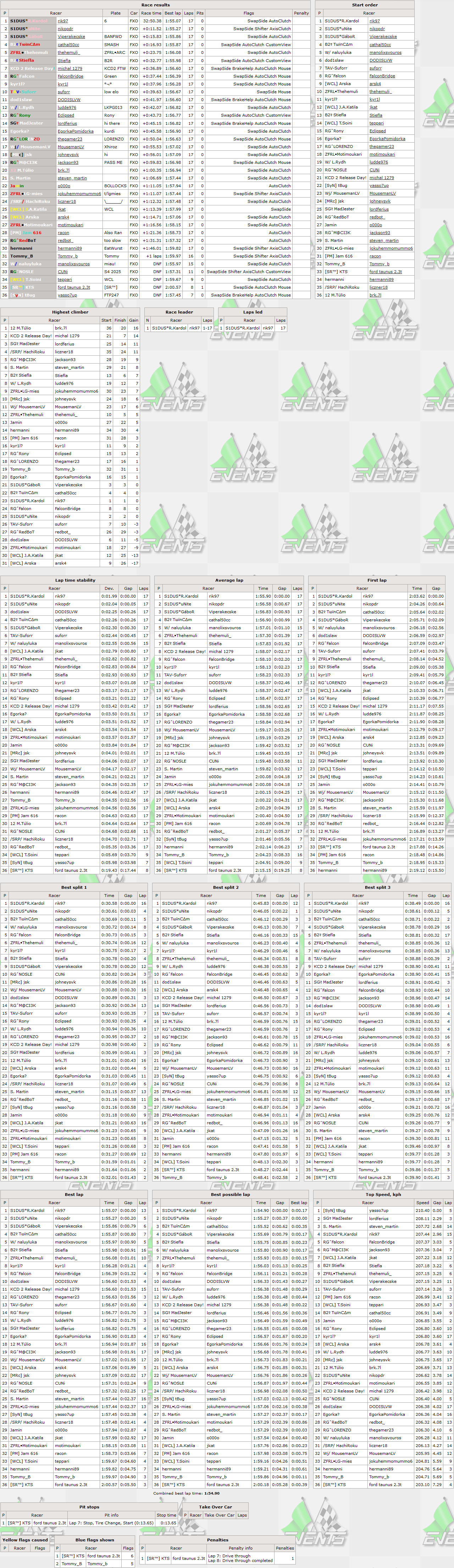 This race went into RTFR XL history as a driver managed to set a new all time record - for the first time ever a driver won more than 4 races in row. Gábor Was the fastest in qualifying by almost a second,scoring his 17th pole position and setting himself on path for the new record. The hungarian led the first 14 laps until his pitstop and regained the lead after his closest rival's pitstop,keeping it despite his 2nd visit of the pitlane - eventually everything was clear as Gábor crossed the finish line as race winner for the 5th time in row,15th overall,scoring also his 16th fastest lap of the race and 25th top5 finish. The combo selector used his selection to improve his best finishing result for the 2nd race in row - he finished 2nd this week,beating his last month's result by a position. The lowest step on podium was taken by fastest finn of this race - Thehemuli repeated his best position and added 6th top5 finish to his stats. Ohnifus scored his 3rd top5 finish by finishing 4th,top5 was closed by the only other driver with lead laps - Zesty scored his 5th top5 finish from 10 total race finishes,climbing a position in final results due his teammate's penalty.