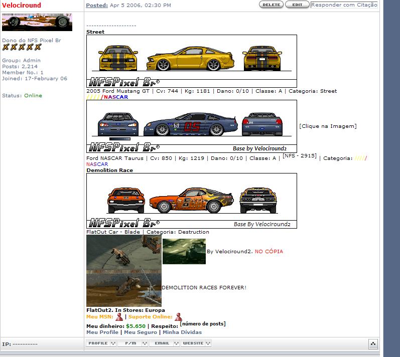Just on a side note: during the NFS Forum [Brazil] (my website in 2006) I made a website about Pixel Cars. I called it NFS Pixel Brazil and everyone from the other websites joined it too... There were car tuning, people had jobs, there were stores for buying things for the cars, and there were plenty of races and things like that for earning money and customizing their pixel cars... it was pretty cool, we even had a war between my website and another pixel car game, PCA ("Pixel Car Advanced"), in which everyone from my websites were registering on PCA for flooding/spamming as much as they could, with huge flood posts and everything... people on PCA tried to do the same but they just couldn't because my security systems were awesome ( ) and then PCA was infested with flood, spam and that kind of posts, they lost the war and closed their website completely... forever. (actually, PCA was created by a user who thought stealing MY pixel cars files and rules of the game was cool, so nobody on my forum liked it and the users decided by themselves to start the war and I liked it . The war ended in 2 weeks.).