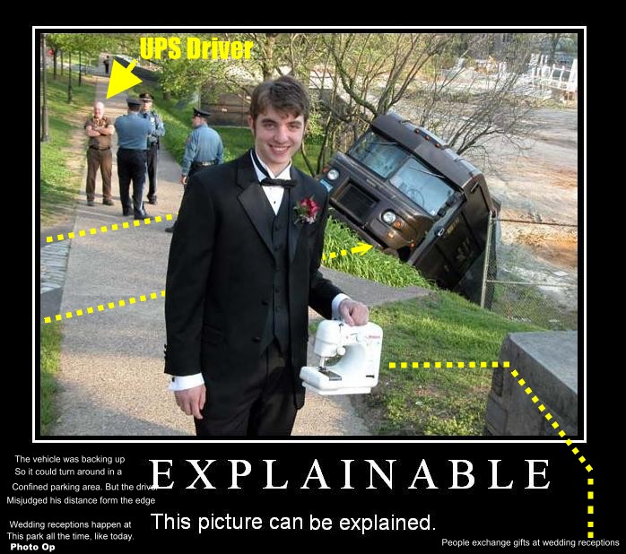 The sewing machine was a wedding gift being delivered by the UPS truck, the driver of the truck forgot to put it in park. The reason for the picture is obviously to demonstrate the reason for the strange situation, which was the sewing machine, which is incomplete because he just took it out of the box without putting it together properly.