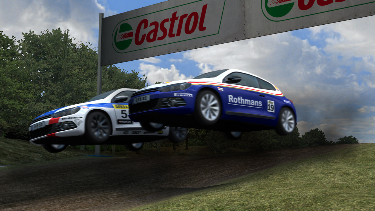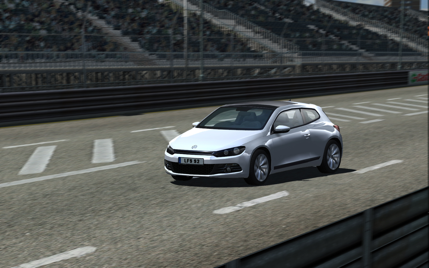 Two or more Volkswagen Sciroccos racing on a LFS track. Because the Scirocco isn't released yet, this necessitates the use of CMX viewer to get the shots of cars and then merge them to an LFS screenshot.
