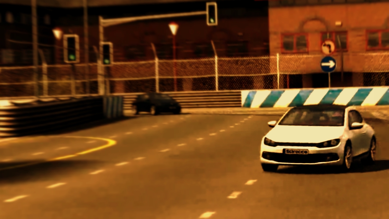 Two or more Volkswagen Sciroccos racing on a LFS track. Because the Scirocco isn't released yet, this necessitates the use of CMX viewer to get the shots of cars and then merge them to an LFS screenshot.