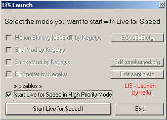 I created a little program, with which you can choose, which programs you want to start before Live for Speed. Great mentionable thing: Works with CrazyICE's Join2LFS ! So you can run your favourite mods (eg. smokemod) with the great ability to click the "Join"-button on LFSWorld