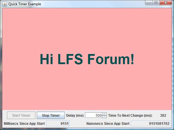Here's a Java example showing a program that uses 3 timers to do different things. One timer switches the background and text colour after a specified delay time, another timer updates the time remaining until the next colour change label and the last timer updates the fields showing how long the program has been running for both in milliseconds and nanoseconds. The delay between changing colours can be changed from 10 milliseconds to 5000 milliseconds. Don't run it low if you have epilepsy (you have been warned! ). Unzip the attached archive and double click the executable JAR file to run the application. Don't run the JAR if you don't trust me. I've attached a sample screenshot of the application. The source for the application can be viewed by extracting the contents of the JAR file and looking at the "tester/MultimediaTimerTester.java" file.