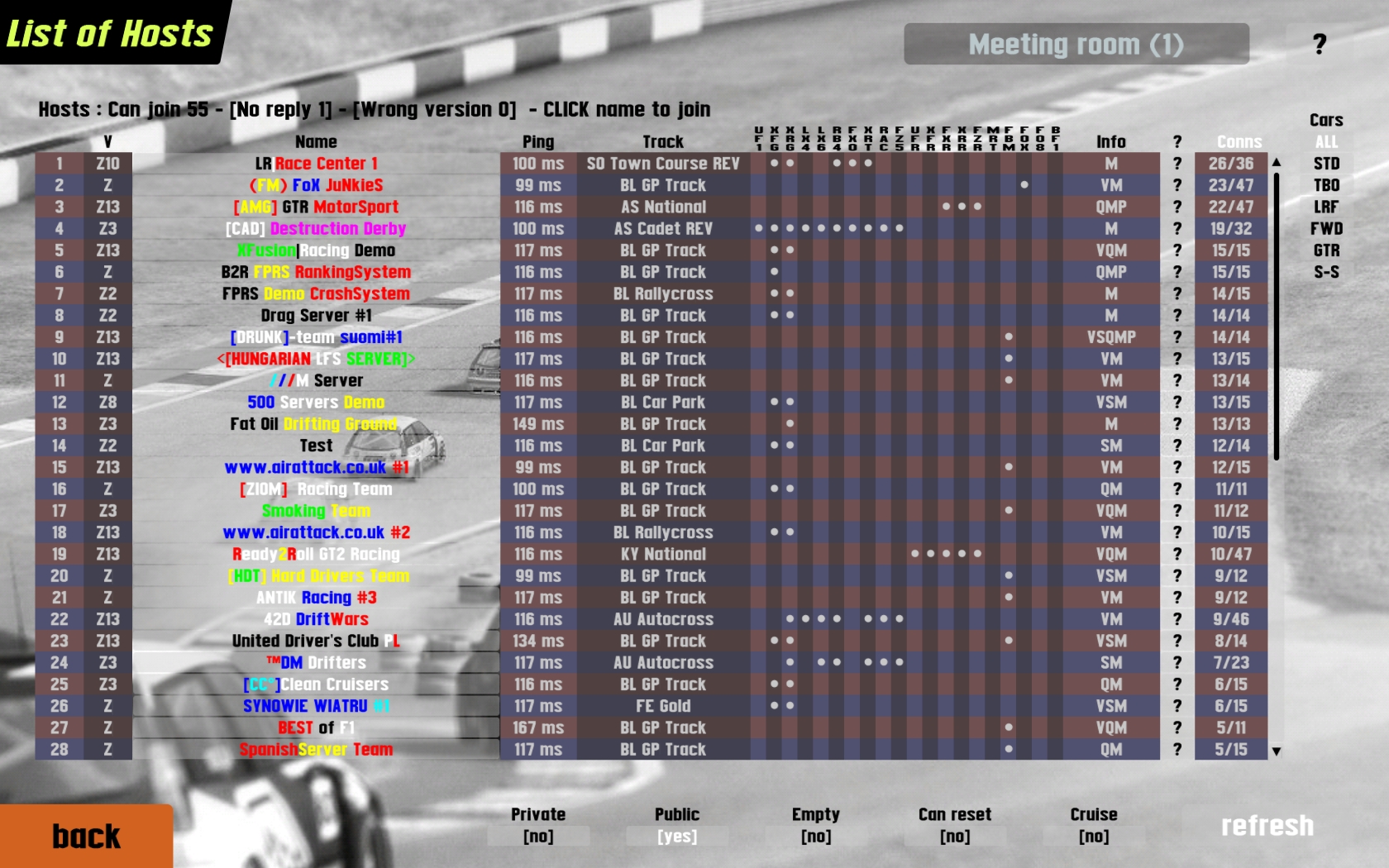 1. I see average online racers at peak time are 1,000. Half run the demo so only 500 are S1/2 users. There are few demo servers so those 500 demo racers are packed into populated servers making finding a popular server easy. I see there are a HUGE number of S2 servers so is it harder to find a good populated server (e.g. 9/12 racers not 2/12)