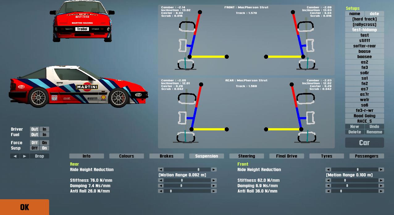 Bit of a nub question from me: I've attached a picture of the suspension view in garage, my question is to do with the yellow section (track/lower control arm right?). Is there any useful relation to setting up a suspension and the angle of the arm? I.e., is there any point in trying to keep it above/below or horizontal. I've tried to read on this, but I'm a bit dim. Does a certain angle cause less/more bump steer or are there other reasons or none at all?
