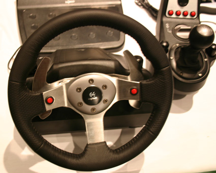 The limited-edition Logitech G25 Racing Wheel will be available in the U.S. and Europe beginning in October. [ed. 2006]