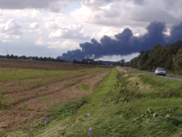 Loads of roads shut and the fire brigade are struggling to put it out from what i can make out, its been alight for about 3 hours and there is still serius smoke, over 100 tonnes of rubber on fire is not good for people who end up breathing the fumes in, luckily the wind isn't blowing my way....yet.