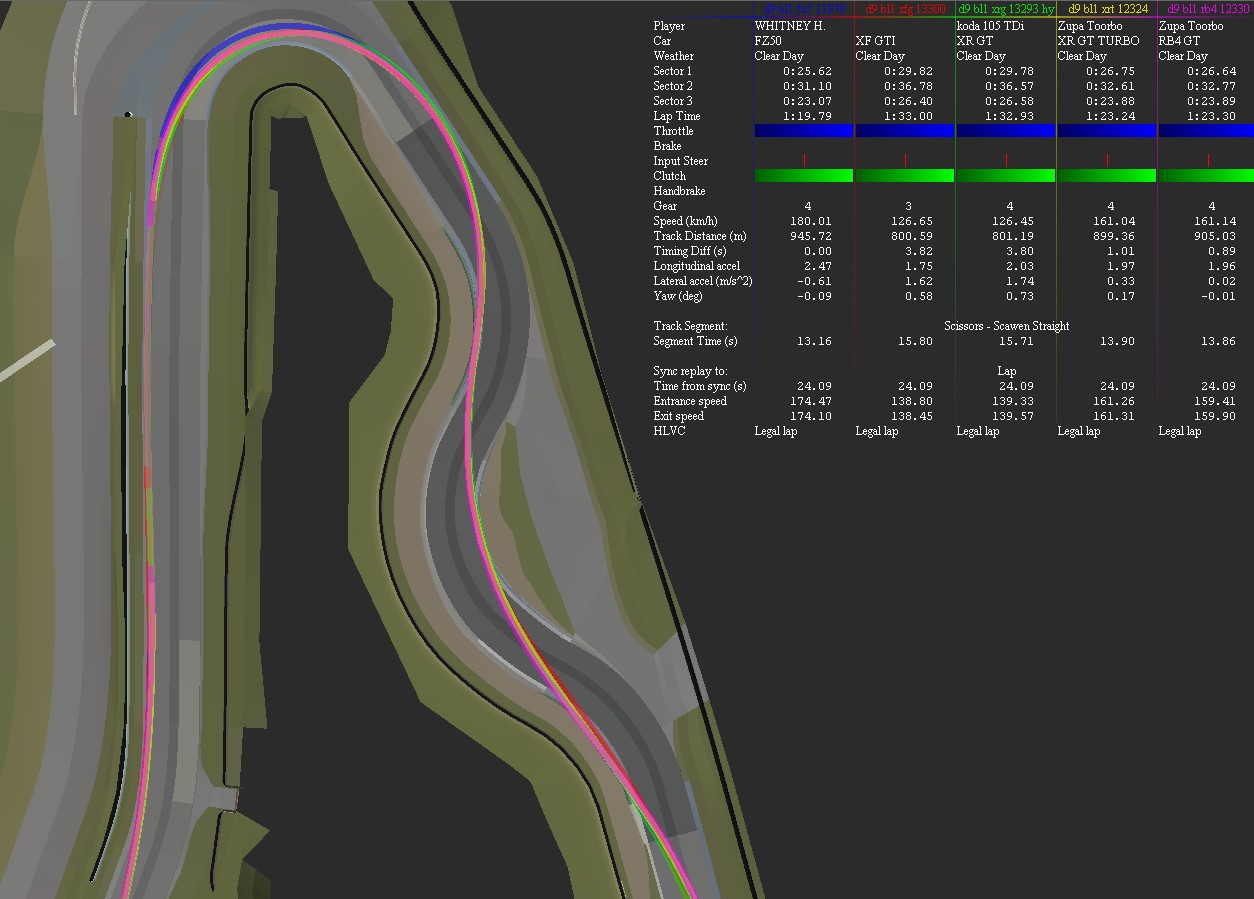 The line which is best is the line which allows you to put the most power down on the exit and gain the highest amount of MPH at the exit of the corner. This does not mean having the straightest exit possible, because to have a straight exit you must make a very tight turn, and this costs MPH.