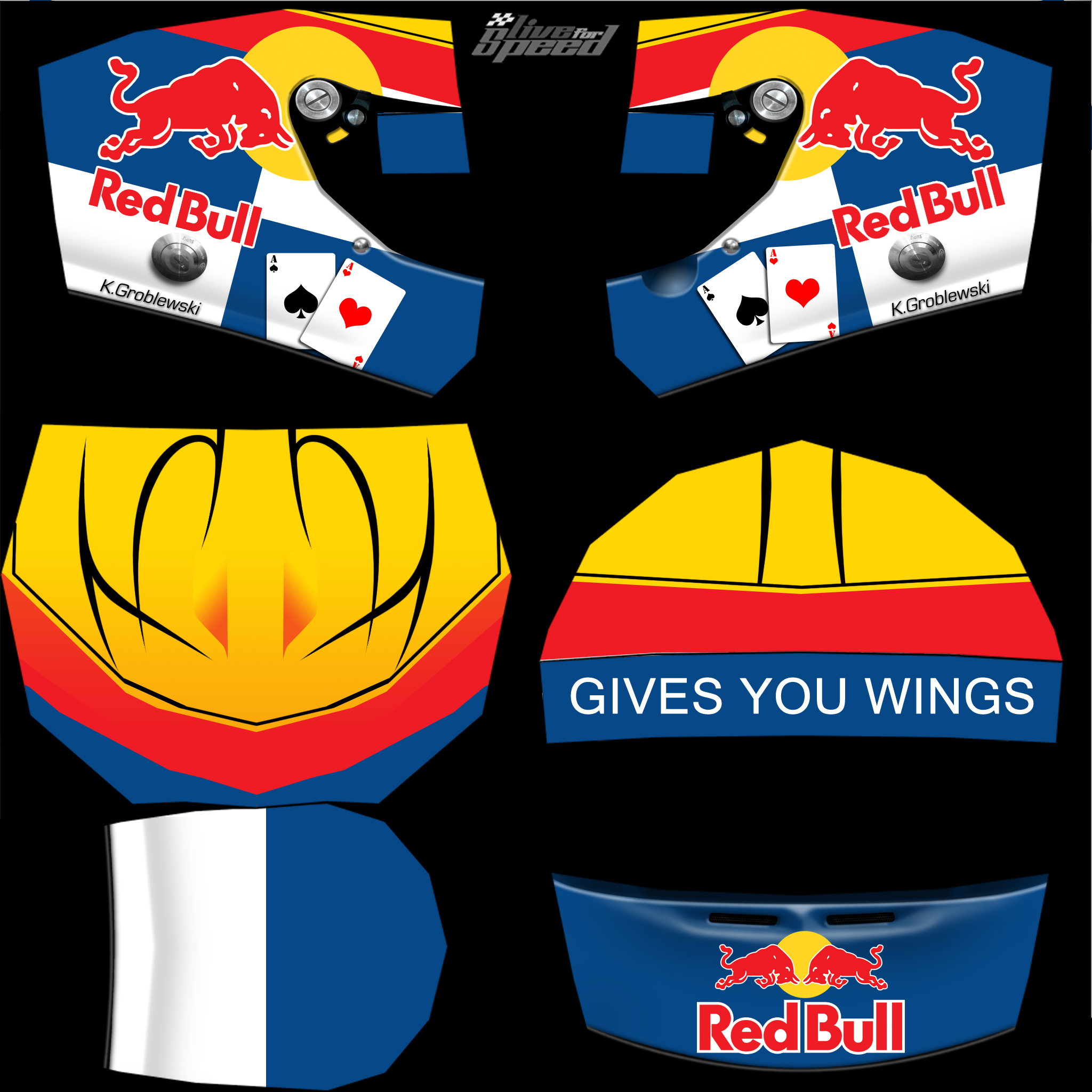 Under a HANS clinch is " K.Groblewski ", and two cards are Ace of Hearts and Spades. On viever is typed "Gives you Wings". Near viever is Red Bull logotype. On a top is same part of Buemi's helmet. On back, next part of Red Bull colors.