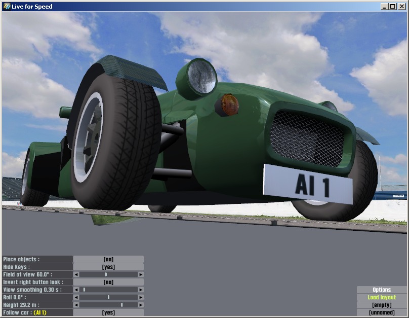 Quote from Scawen :I'm not sure it would be very artistic, being able to see through the ground. That is the problem with allowing the camera to go to zero height. The bottom half of the image is underground, you can see edge of the clipping plane plus distant objects through the "ground" and it's one of those things we try to avoid as game developers. There's no cars or world there at all, just a load of textured triangles but we try to avoid showing that.