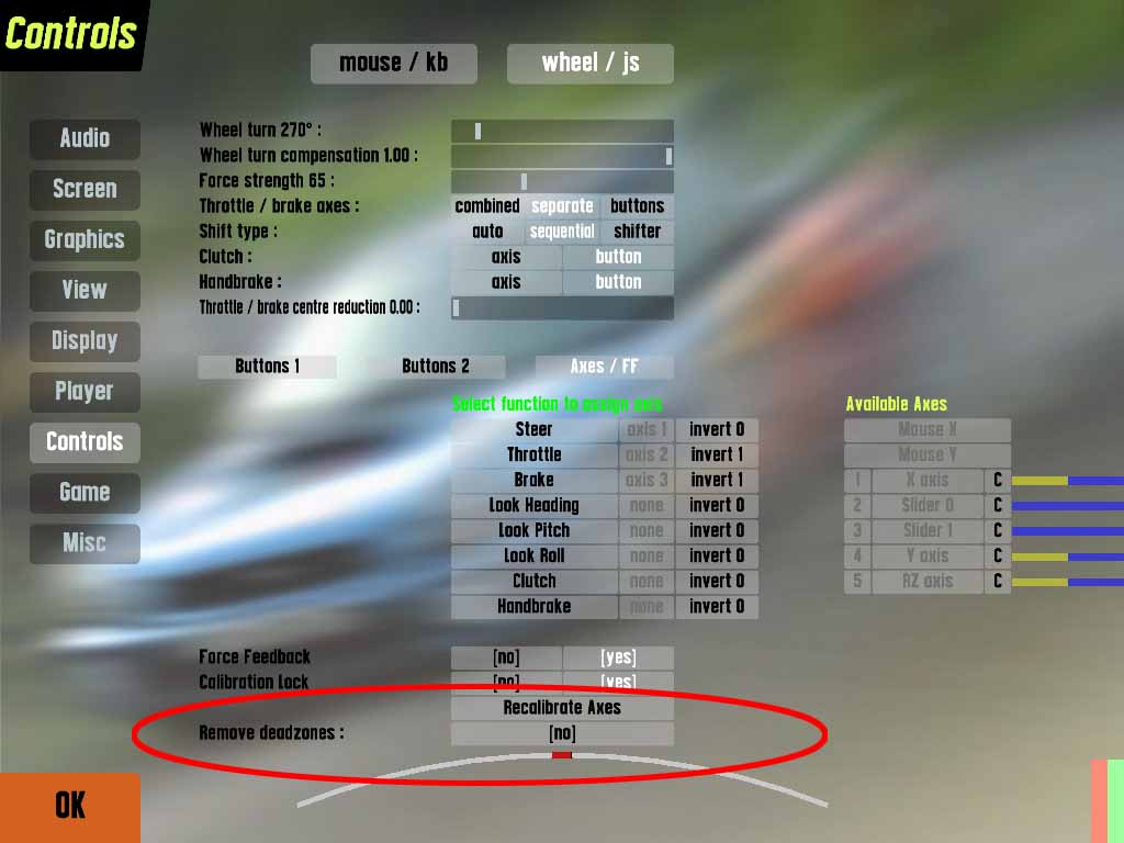 I'm using u sidewinder precision pro joystick which works fine overall (after a lot of tweaking with different settings) but it is way too sensitive around the centre. This results in very difficult control at high speed (I simply cannot hold a straight line) and in breaking zones (very often resulting in a spin during breaking). A deadzone, I think, would very much improve this but I don't know how, if it is at all possible, to set it.