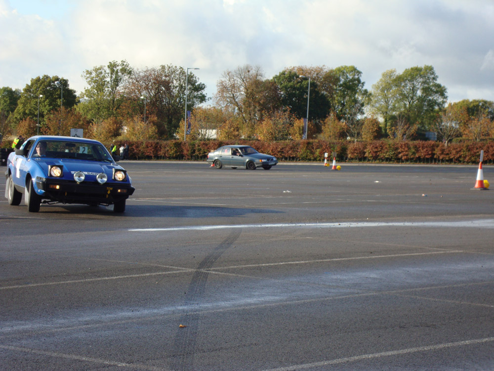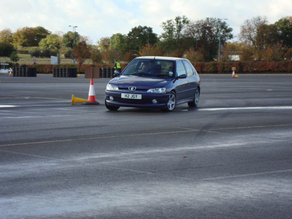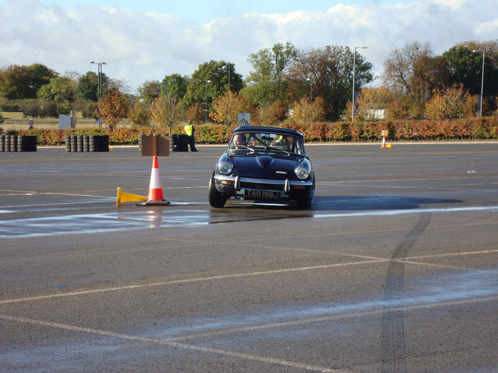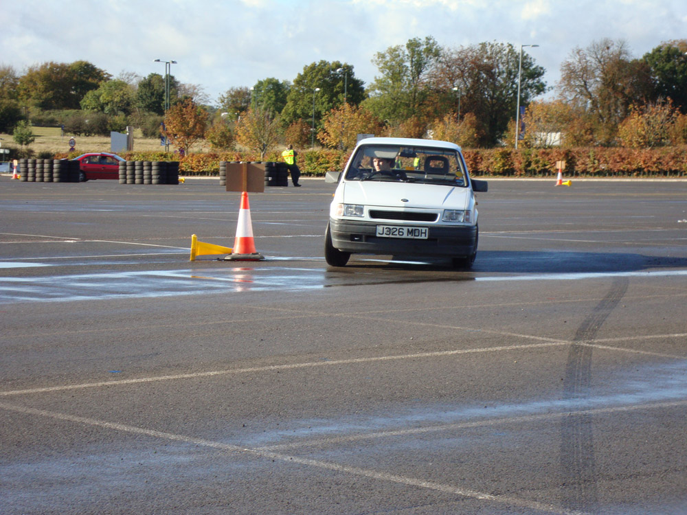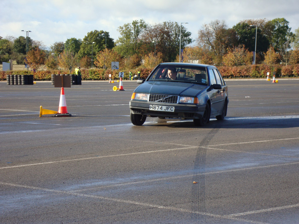Got in the car fairly early starting off with a basic slalom, long turn to step out on then a "rolling donut" (i.e. wide-radius donut round a fixed point) - most people pussied out on the long turn, and understeered on the donut, then on their next go booted it and... spun. I managed to do quite well and took to the whole weight transfer thing pretty well, despite stalling the car. This was on a car park with cones, and several people managed to eat the cones.