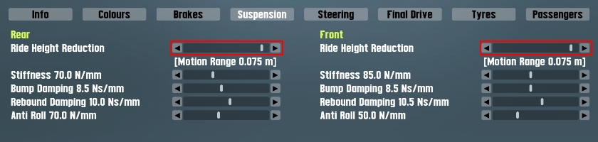 Although I remember ride height reduction used to work, so maybe that got disabled intentionally (as the numbers did not correspond with the only displayed value, the motion range).