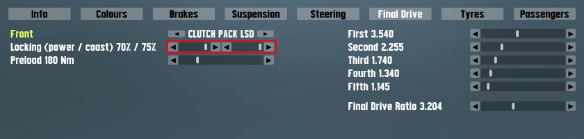 - Final Drive > Clutch Pack LSD > Locking (power / coast)